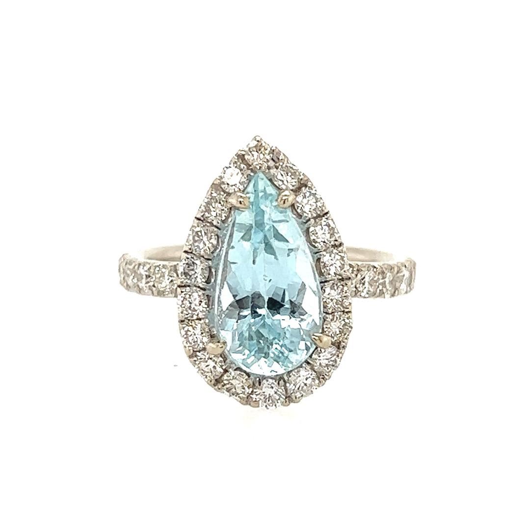 One electronically tested 14KT white gold lady's cast fashion ring with a pear shaped halo with a bright polish finish. Condition is new. good workmanship. The featured lady's ring has a shank measuring 2.30 millimeters in width. Identified with markings of "14K". Containing: One prong set pear modified mixed cut natural aquamarine, measuring 12.80 x 6.85 x 5.89mm, (depth est.) approximate weight of 2.50ct., clarity is eye clean, medium light, moderately strong, very slightly greenish blue color, (GIA vslgB 4/4), cut is very good. Transmitting light with no distortion, transparent. Colored gemstones are presumed to have been subjected to commonly used enhancement processes. Graded in the setting. Thirty prong set round brilliant cut diamonds, measuring 2.10 -2.00 x 1.27mm (depth est.) approximate total weight of 30 Stones = 1.01ct. Graded in the setting. Color G - H Clarity VS-2 to SI-1 Cut Very Good Total Weight of Colored Stones Total Weight of Diamonds Total Weight of Ring 2.50ct. 1.01ct. 4.80gm Appraisal No: 000022197003 Total Estimated Retail Value $ 6490.00