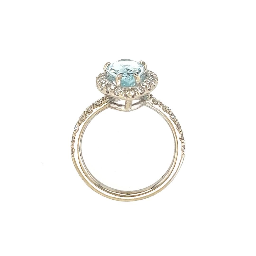 One electronically tested 14KT white gold lady's cast fashion ring with a pear shaped halo with a bright polish finish. Condition is new. good workmanship. The featured lady's ring has a shank measuring 2.30 millimeters in width. Identified with markings of "14K". Containing: One prong set pear modified mixed cut natural aquamarine, measuring 12.80 x 6.85 x 5.89mm, (depth est.) approximate weight of 2.50ct., clarity is eye clean, medium light, moderately strong, very slightly greenish blue color, (GIA vslgB 4/4), cut is very good. Transmitting light with no distortion, transparent. Colored gemstones are presumed to have been subjected to commonly used enhancement processes. Graded in the setting. Thirty prong set round brilliant cut diamonds, measuring 2.10 -2.00 x 1.27mm (depth est.) approximate total weight of 30 Stones = 1.01ct. Graded in the setting. Color G - H Clarity VS-2 to SI-1 Cut Very Good Total Weight of Colored Stones Total Weight of Diamonds Total Weight of Ring 2.50ct. 1.01ct. 4.80gm Appraisal No: 000022197003 Total Estimated Retail Value $ 6490.00