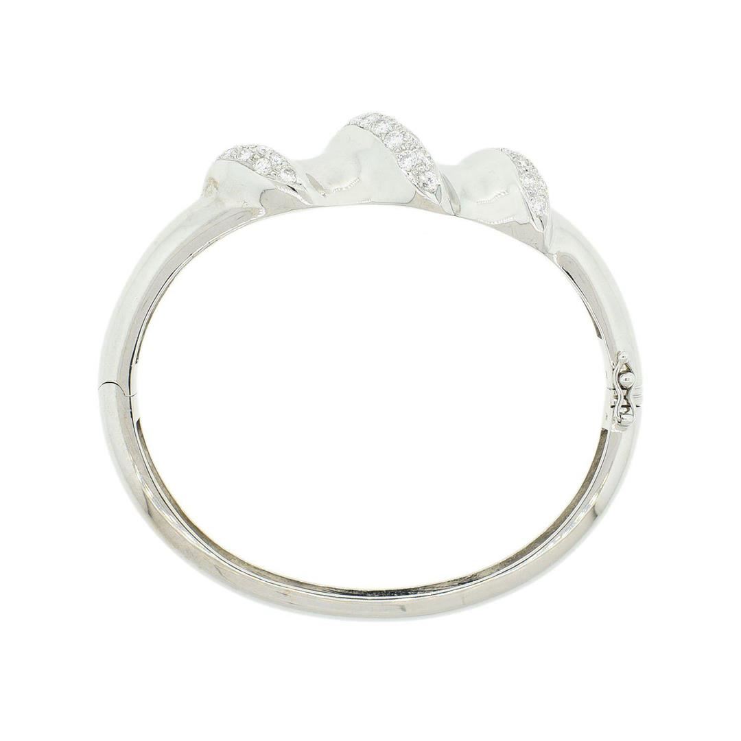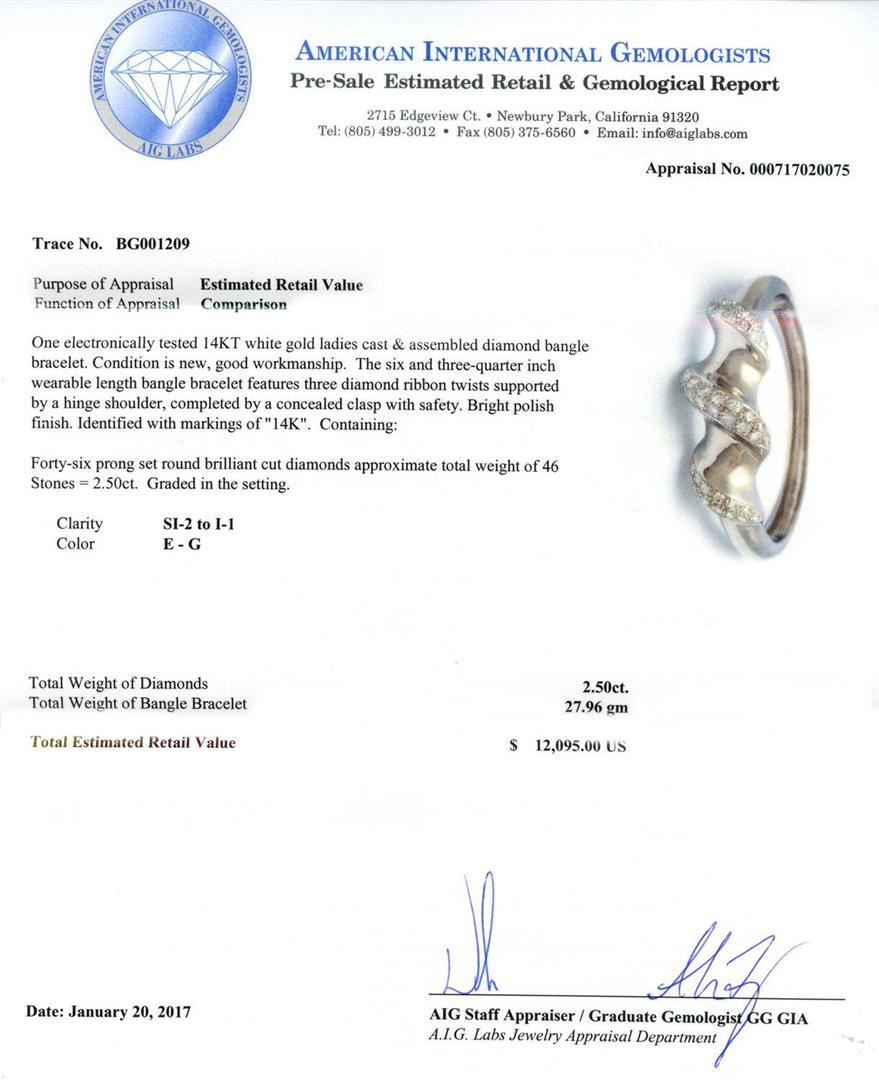 One electronically tested 14KT white gold ladies cast & assembled diamond bangle bracelet. Condition is new, good workmanship. The six and three-quarter inch wearable length bangle bracelet features three diamond ribbon twists supported by a hinge shoulder, completed by a concealed clasp with safety. Bright polish finish. Identified with markings of "14K". Containing: Forty-six prong set round brilliant cut diamonds approximate total weight of 46 Stones = 2.50ct. Graded in the setting. Clarity SI-2 to I-1 Color E - G Total Weight of Diamonds 2.50ct. Total Weight of Bangle Bracelet 27.96 gm