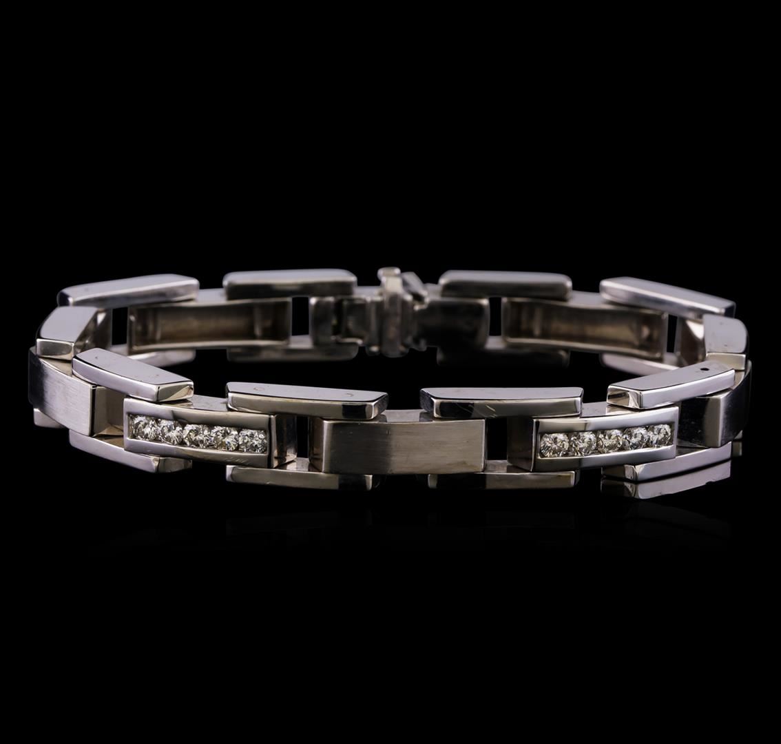 One electronically tested 14KT white gold gents cast & assembled diamond bracelet. Eight and one-quarter inch length bracelet features a flexible chain of alternating brushed links and diamond set links, terminating in a concealed clasp with safety. Bright and satin finish. Identified with markings of "14K". Condition is good. Containing: Twenty-Four channel set round brilliant cut diamonds, measuring 3.10 - 3.00 x 1.83mm (depth est.) approximate total weight of 24 Stones = 2.50ct. Measurements are an average for the group. The color grade reflects the entire range of color for this group. Graded in the setting. Clarity: SI-2 to I-2. Color: G - J. Total Weight of Diamonds 2.50ct. Total Weight of Bracelet 66.13gm. AIG Appraised at $18,155.00.