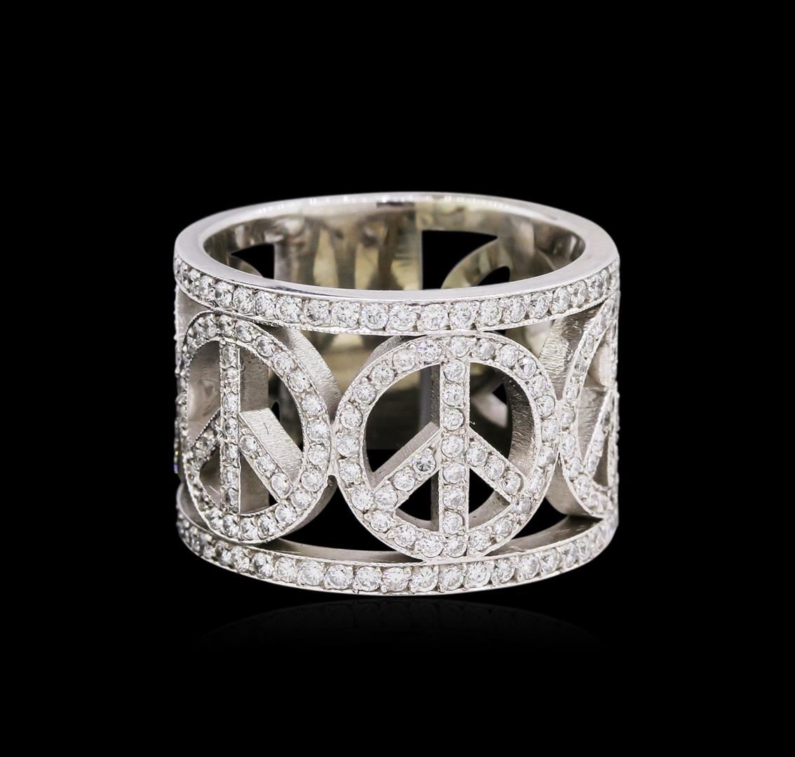 One electronically tested 14KT white gold lady's cast fashion ring with a wide band with a bright polish with milgrain detailing finish. Condition is new, good workmanship. The featured lady's ring has five connecting peace sign motifs and a shank measuring 15.25 millimeters wide. Containing: Eighty-four bead set round brilliant cut diamonds, measuring 1.50 - 1.40 x 0.94mm (depth est.) approximate total weight of 84 stones = 1.00ct. Graded in the setting. Clarity: SI-1 to SI-2. Color: H-I. Cut: Good. One hundred eighty-five bead set round brilliant cut diamonds, measuring 1.30 - 1.25 x 0.81mm (depth est.) approximate total weight of 185 Stones = 1.50ct. Graded in the setting. Clarity: SI-1 to SI-2. Color: H-I. Cut: Good. Total Weight of Diamonds: 2.50ct. Total Weight of Ring: 14.50 grams. GAS Appraised at $8,280.00.