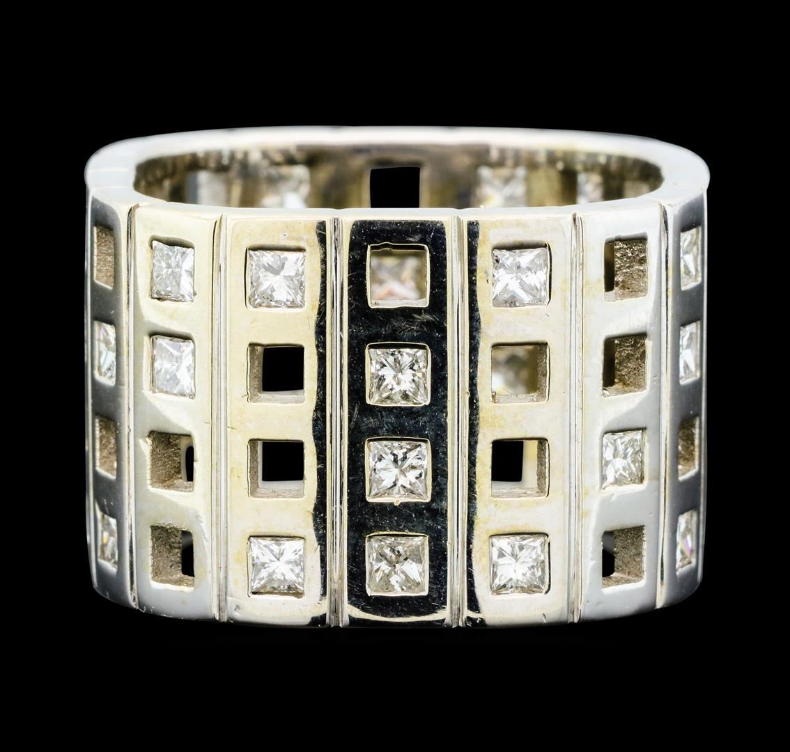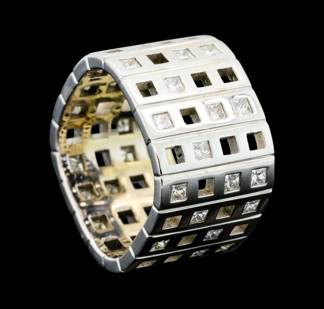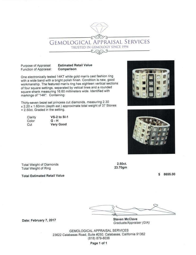 One electronically tested 14KT white gold man's cast fashion ring with a wide band with a bright polish finish. The featured man's ring has eighteen vertical sections of four square settings, separated by vetical lines and a rounded square shank measuring 16.60 millimeters wide. Identified with markings of '14K'. Condition is new, good workmanship. Containing: Thirty-Seven bezel set princess cut diamonds, measuring 2.30 x 2.20 x 1.60mm (depth est.) approximate total weight of 37 Stones = 2.50ct. Graded in the setting. Clarity VS-2 to SI-1. Color: G - H Cut Very Good. Total Weight of Diamonds 2.50ct.. Total Weight of Ring 23.70gm GAS Appraised at $8,655.00.