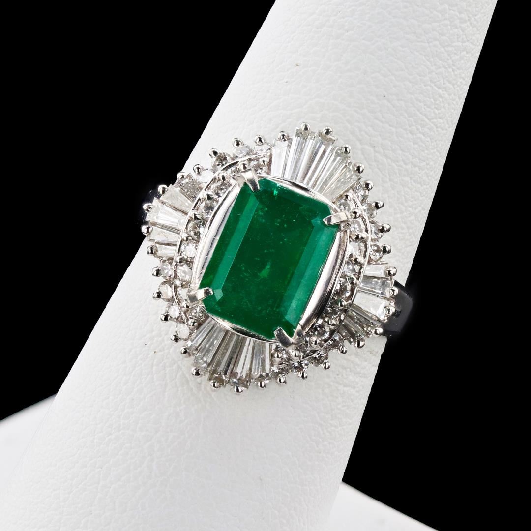 One electronically tested platinum ladies cast emerald and diamond ring with a bright polish finish. Condition is new, good workmanship. The featured emerald is set within a stylized tiered diamond bezel, completed by a grooved two and one-half millimeter wide band. Identified with markings of "PT900" One prong set rectangular step cut natural emerald, measuring 9.30 x 6.65 x 4.53mm, 6% bulge factor, approximate weight of 2.50ct., clarity is moderately included, type III, medium dark, moderately strong, very slightly bluish green color, (GIA vslbG 6/4), cut is good. Transmitting light somewhat diffusely, transparent to translucent. Naturally occurring internal & external characteristics are present. Indications of oil residue. Graded in the setting Fifty-four prong set round brilliant & baguette cut diamonds approximate total weight of 54 Stones = 1.04ct. Graded in the setting Clarity VS-2 to SI-2 Color G - I Total Weight of Colored Stones 2.50ct Total of Diamonds 1.04ct Total Weight of Ring 9.62 gm Size: 7