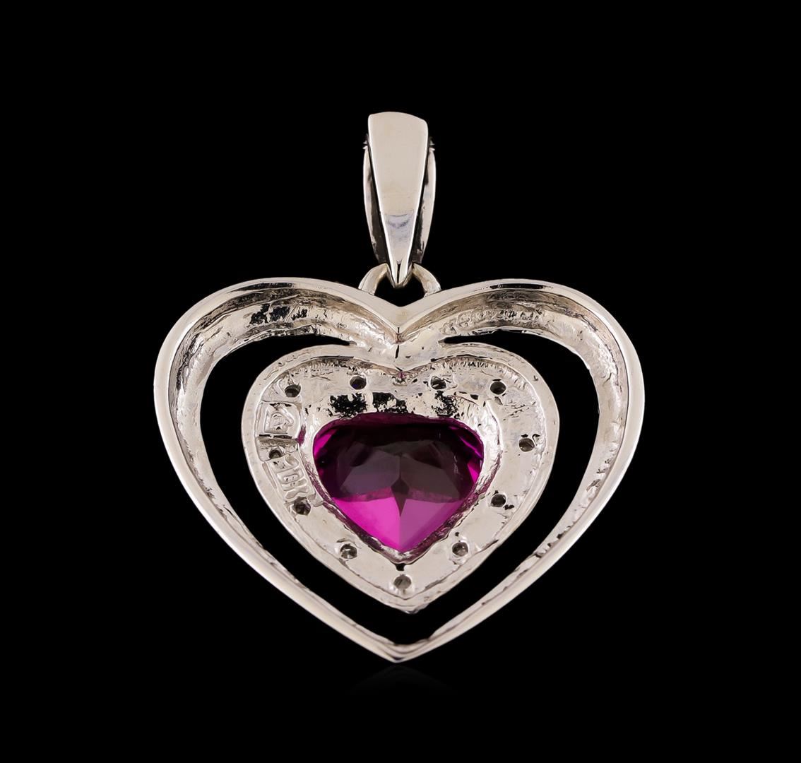 One heart shaped pendant featuring: 10KT white gold weighing 4.10 grams containing one heart shaped rubellite center weighing 2.50ct and diamonds weighing 0.10ctw.