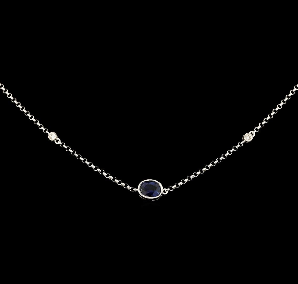 One electronically tested 18KT white gold lady's combination cast & assembled diamonds by the yard necklace with a lobster claw clasp with a bright polish with milgrain detailing finish. The featured lady's necklace has a 1.6mm thick rolo chain with four diamond bezel links and three oval sapphire links that can be worn between sixteen and approximately eighteen inches in length. Identified with markings of '18K 750'. Condition is new, good workmanship. Containing: Three bezel set oval modified mixed cut natural blue sapphires, measuring 6.10 x 4.86 x 3.30mm, (depth est.) approximate total weight of 2.50ct., clarity is slightly included, medium dark, strong, blue color, (GIA B 6/5), cut is good. Transmitting light with a minimum of distortion, transparent. Colored gemstones are presumed to have been subjected to commonly used enhancement processes. Graded in the setting. Four prong set single cut diamonds, measuring 1.60 - 1.50 x 0.96mm (depth est.) approximate total weight of 4 Stones = 0.06ct. Graded in the setting. Clarity SI-1 to SI-2. Color: H - I Cut Good. Total Weight of Colored Stones 2.50ct.. Total Weight of Diamonds 0.06ct.. Total Weight of Necklace 5.20gm. GAS Appraised at $3,605.00.