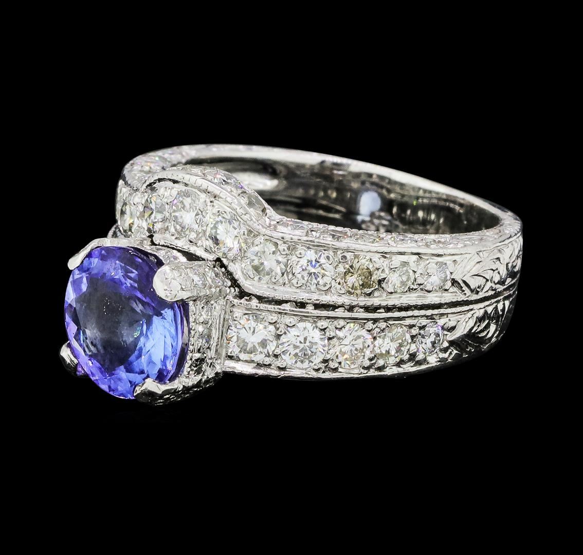 One electronically tested platinum lady's combination cast & assembled fashion ring and attached band with a cathedral shank with a bright polish with milgrain detailing finish. The featured lady's ring has hand engraved detail and a double shank measuring 5.63 millimeters wide. Identified with markings of 'PLAT'. Condition is new, good workmanship. Containing: One prong set round modified brilliant cut natural tanzanite, measuring 8.50 - 8.47 x 4.53 mm, (depth est.) 10%. bulge factor, approximate weight of 2.50ct., clarity is eye clean, medium light, very slightly grayish, violet color, (GIA V 4/3), cut is very good. Transmitting light with no distortion, transparent. Colored gemstones are presumed to have been subjected to commonly used enhancement processes. Graded in the setting. Twenty-Three prong set round brilliant cut diamonds, measuring 2.80 - 2.40 x 1.56mm (depth est.) approximate total weight of 23 Stones = 1.48ct. Graded in the setting. Color G - I Clarity VS-1 to SI-1 Cut Very Good Twenty prong set round brilliant cut diamonds, measuring 1.90 - 1.50 x 1.05mm (depth est.) approximate total weight of 20 Stones = 0.37ct. Graded in the setting. Color G - I Clarity VS-2 to SI-2 Cut Good Twenty-Seven prong set round brilliant cut diamonds, measuring 1.20 - 1.10 x 0.69mm (depth est.) approximate total weight of 27 Stones = 0.15ct. Graded in the setting. Color G - I Clarity VS-2 to SI-2 Cut Good. Total Weight of Colored Stones 2.50ct.. Total Weight of Diamonds 2.00ct.. Total Weight of Ring And Attached Band 15.60gm GAS Appraised at $9540.00. GAS Appraised at $9,540.00.