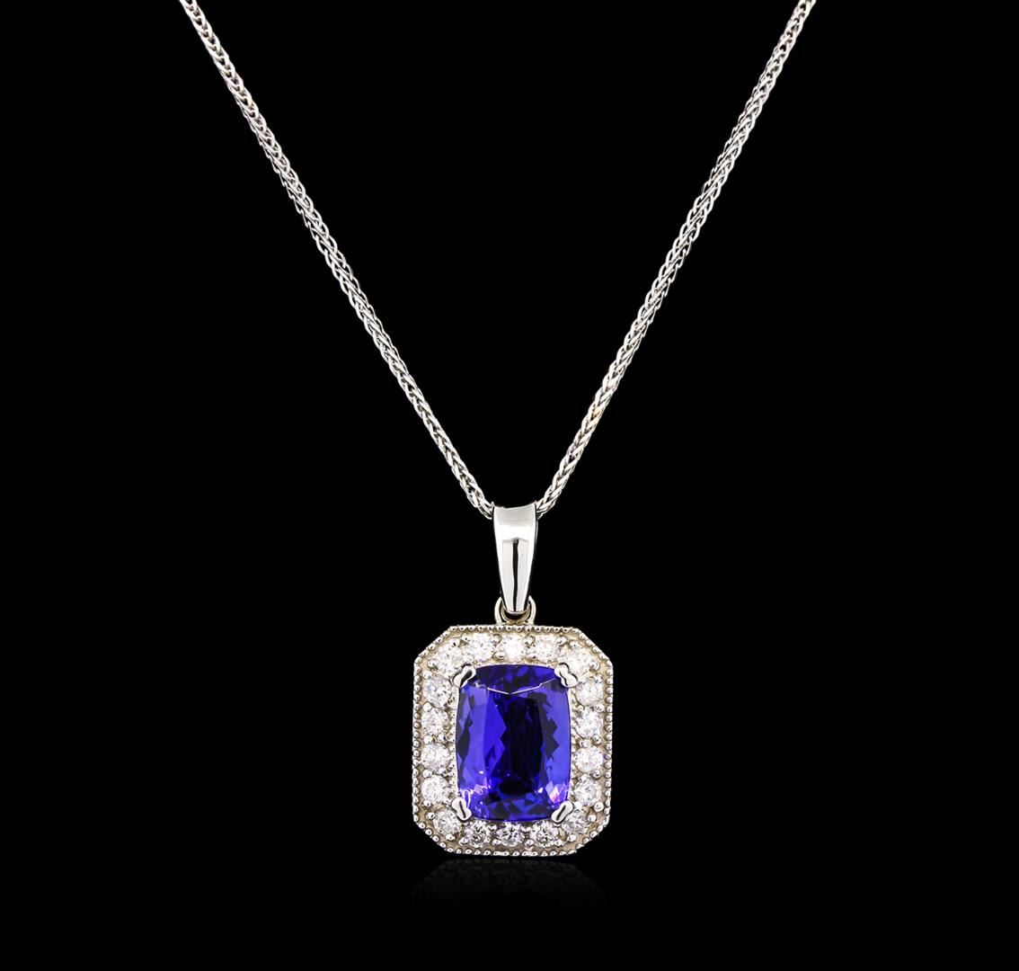 One electronically tested 14KT white gold lady's cast fashion pendant & chain 18.0" long, 1mm polished foxtail link with a lobster claw clasp with a cushion halo with a bright polish with milgrain detailing finish. Identified with markings of "14K". Condition is new, good workmanship. Containing: One prong set rectangular cushion modified brilliant cut natural tanzanite, measuring 9.62 x 7.07 x 4.21mm, 10% bulge factor, approximate weight of 2.50ct., clarity is eye clean, type I, medium dark, moderately strong, violetish blue color, (GIA vB 6/4), cut is very good. Transmitting light with no distortion, transparent. Colored gemstones are presumed to have been subjected to commonly used enhancement processes. Graded in the setting. Eighteen prong set round brilliant cut diamonds, measuring 1.90 - 1.85 x 1.17mm (depth est.) approximate total weight of 18 Stones = 0.45ct. Graded in the setting. Clarity: SI-2 to I-1. Color: H - I. Cut Good. Total Weight of Colored Stones 2.50ct. Total Weight of Diamonds 0.45ct. Total Weight of Pendant & Chain 5.10gm. GAS Appraised at $5,060.00.