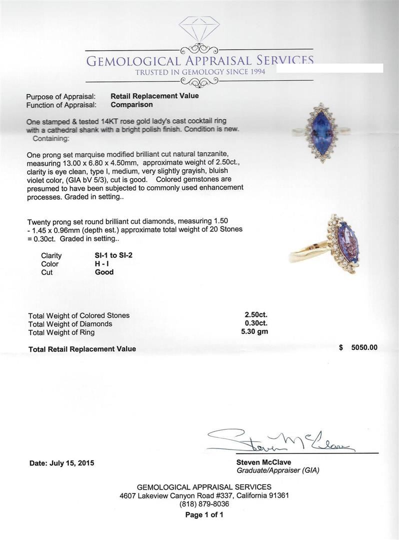 One stamped & tested 14KT rose gold lady's cast cocktail ring with a cathedral shank with a bright polish finish. Condition is new. Containing: One prong set marquise modified brilliant cut natural tanzanite, measuring 13.00 x 6.80 x 4.50mm, approximate weight of 2.50 ct., clarity is eye clean, type I, medium, very slightly grayish, bluish violet color, (GIA bV 5/3), cut is good. Colored gemstones are presumed to have been subjected to commonly used enhancement processes. Graded in setting. Twenty prong set round brilliant cut diamonds, measuring 1.50 - 1.45 x 0.96mm (depth est.) approximate total weight of 20 Stones = 0.30 ct. Graded in setting. Clarity: SI-1 to SI-2. Color: H - I. Cut: Good. Total Weight of Colored Stones: 2.50 ct. Total Weight of Diamonds: 0.30 ct. Total Weight of Ring: 5.30 gm. GAS Appraised.