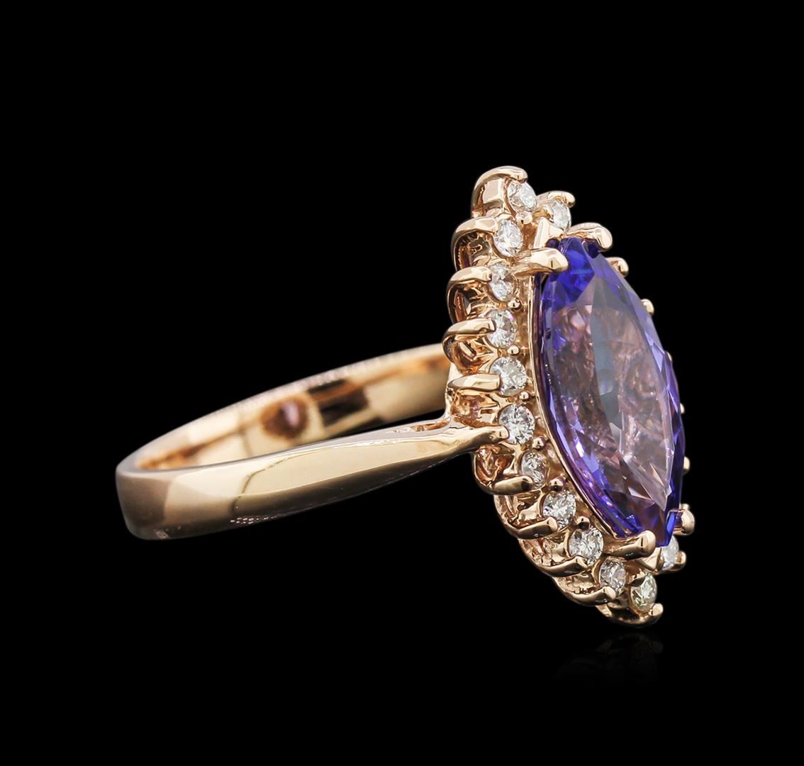 One stamped & tested 14KT rose gold lady's cast cocktail ring with a cathedral shank with a bright polish finish. Condition is new. Containing: One prong set marquise modified brilliant cut natural tanzanite, measuring 13.00 x 6.80 x 4.50mm, approximate weight of 2.50 ct., clarity is eye clean, type I, medium, very slightly grayish, bluish violet color, (GIA bV 5/3), cut is good. Colored gemstones are presumed to have been subjected to commonly used enhancement processes. Graded in setting. Twenty prong set round brilliant cut diamonds, measuring 1.50 - 1.45 x 0.96mm (depth est.) approximate total weight of 20 Stones = 0.30 ct. Graded in setting. Clarity: SI-1 to SI-2. Color: H - I. Cut: Good. Total Weight of Colored Stones: 2.50 ct. Total Weight of Diamonds: 0.30 ct. Total Weight of Ring: 5.30 gm. GAS Appraised.