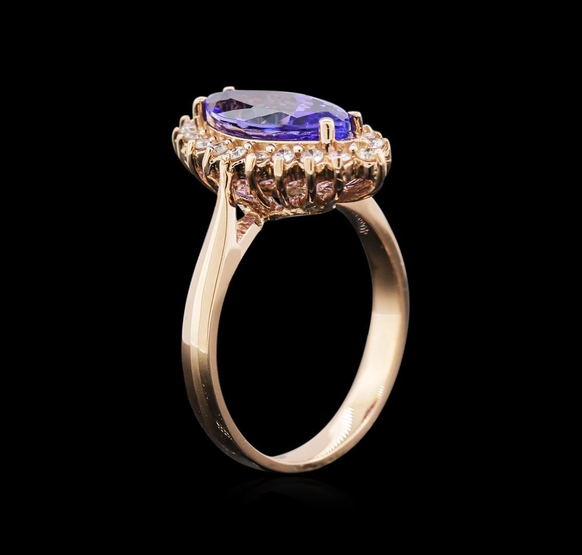 One stamped & tested 14KT rose gold lady's cast cocktail ring with a cathedral shank with a bright polish finish. Condition is new. Containing: One prong set marquise modified brilliant cut natural tanzanite, measuring 13.00 x 6.80 x 4.50mm, approximate weight of 2.50 ct., clarity is eye clean, type I, medium, very slightly grayish, bluish violet color, (GIA bV 5/3), cut is good. Colored gemstones are presumed to have been subjected to commonly used enhancement processes. Graded in setting. Twenty prong set round brilliant cut diamonds, measuring 1.50 - 1.45 x 0.96mm (depth est.) approximate total weight of 20 Stones = 0.30 ct. Graded in setting. Clarity: SI-1 to SI-2. Color: H - I. Cut: Good. Total Weight of Colored Stones: 2.50 ct. Total Weight of Diamonds: 0.30 ct. Total Weight of Ring: 5.30 gm. GAS Appraised.