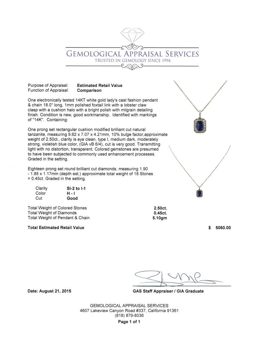 One electronically tested 14KT white gold lady's cast fashion pendant & chain 18.0" long, 1mm polished foxtail link with a lobster claw clasp with a cushion halo with a bright polish with milgrain detailing finish. Identified with markings of "14K". Condition is new, good workmanship. Containing: One prong set rectangular cushion modified brilliant cut natural tanzanite, measuring 9.62 x 7.07 x 4.21mm, 10% bulge factor, approximate weight of 2.50ct., clarity is eye clean, type I, medium dark, moderately strong, violetish blue color, (GIA vB 6/4), cut is very good. Transmitting light with no distortion, transparent. Colored gemstones are presumed to have been subjected to commonly used enhancement processes. Graded in the setting. Eighteen prong set round brilliant cut diamonds, measuring 1.90 - 1.85 x 1.17mm (depth est.) approximate total weight of 18 Stones = 0.45ct. Graded in the setting. Clarity: SI-2 to I-1. Color: H - I. Cut Good. Total Weight of Colored Stones 2.50ct. Total Weight of Diamonds 0.45ct. Total Weight of Pendant & Chain 5.10gm. GAS Appraised at $5,060.00.