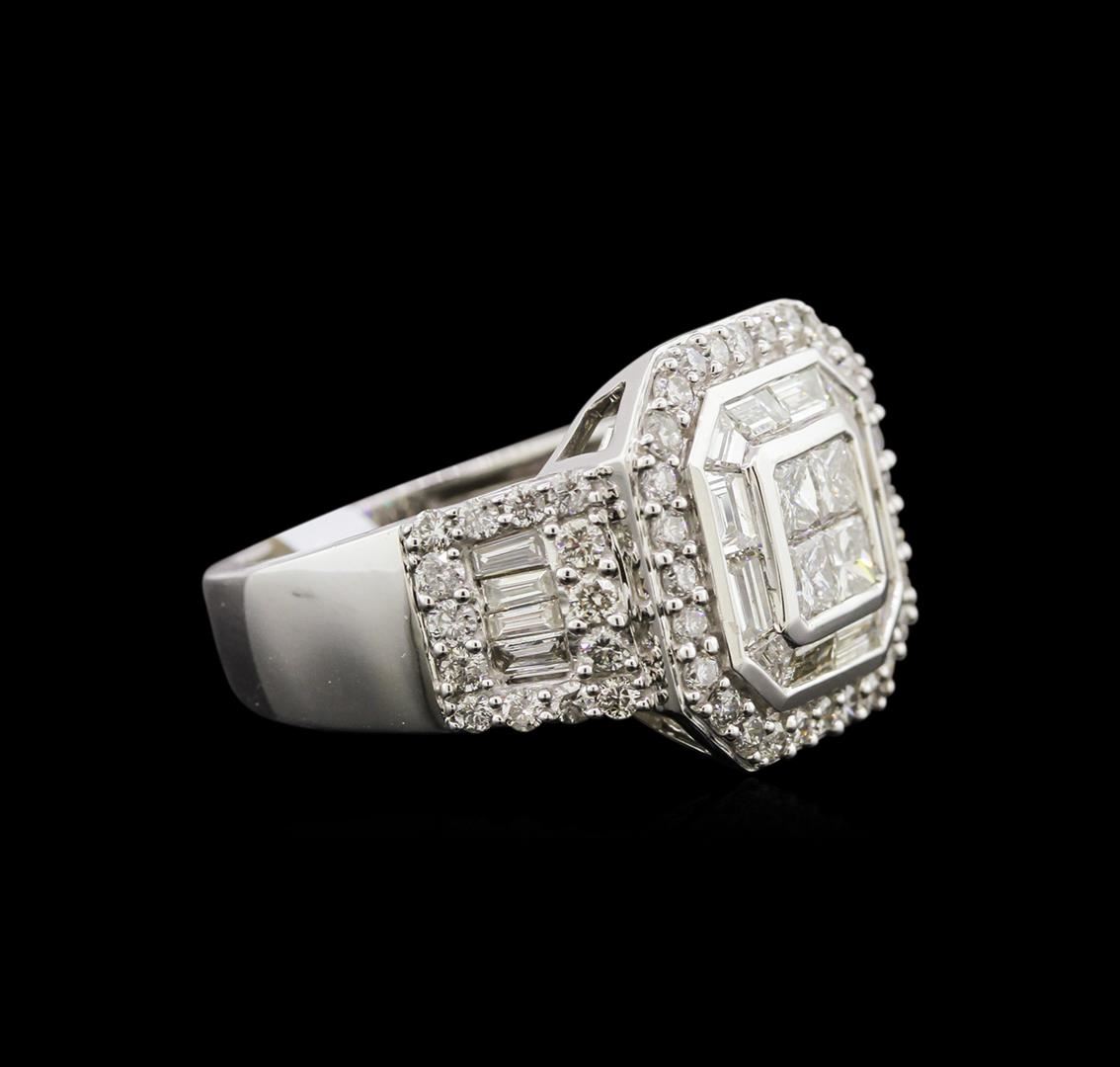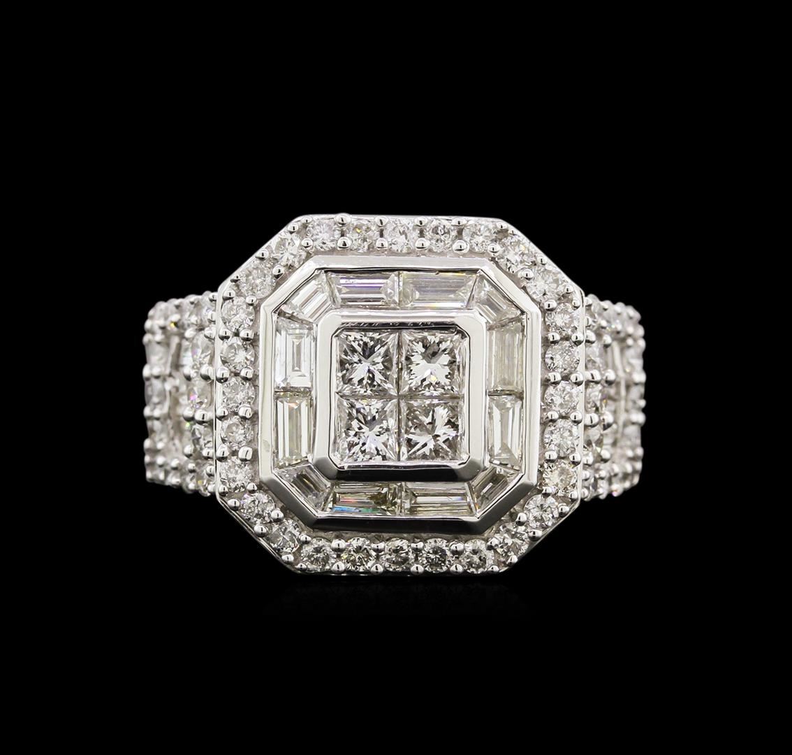 One electronically tested 10KT white gold man's cast fashion ring with a tapered shank with a bright polish finish. Condition is new. Identified with markings of "10K". Containing: Four invisible set princess cut diamonds, measuring 2.80 x 2.70 x 2.03mm (depth est.) approximate total weight of 4 Stones = 0.50ct. Graded in the setting. Clarity: SI-2. Color: I - J. Cut: Good. Twenty channel set baguette cut diamonds, measuring 3.50 x 2.00 x 1.70mm (depth est.) approximate total weight of 20 Stones = 0.94ct. Graded in the setting. Clarity: SI-1 to SI-2. Color: H - J. Cut: Good. Fifty-six prong set round brilliant cut diamonds, measuring 1.70 - 1.60 x 0.99mm (depth est.) approximate total weight of 56 Stones = 1.06ct. Graded in the setting. Clarity: SI-1 to I-1. Color: H - I. Cut: Good. Total Weight of Diamonds: 2.50ct. Total Weight of Ring: 8.10 gm. GAS Appraised at $9,465.00.
