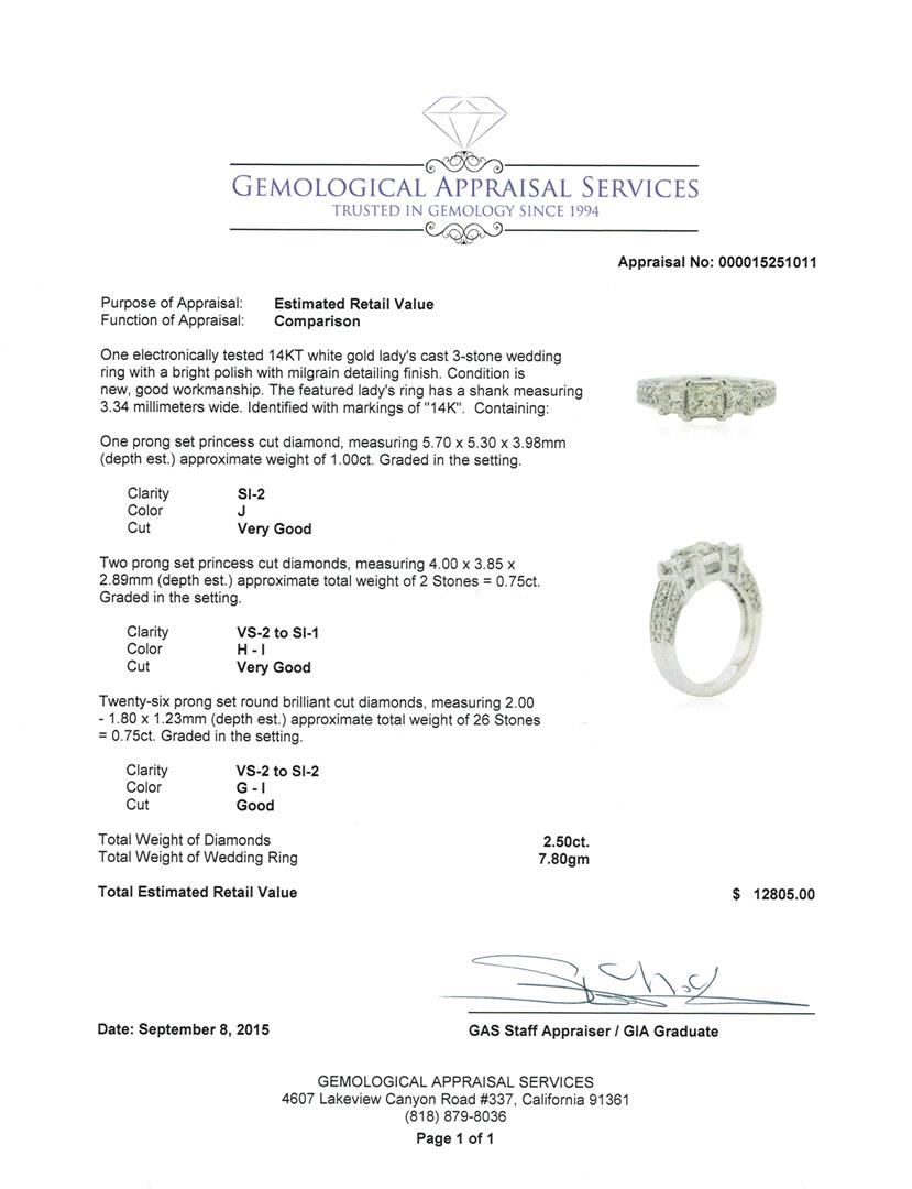 One electronically tested 14KT white gold lady's cast 3-stone wedding ring with a bright polish with milgrain detailing finish. The featured lady's ring has a shank measuring 3.34 millimeters wide. Identified with markings of "14K". Condition is new, good workmanship. Containing: One prong set princess cut diamond, measuring 5.70 x 5.30 x 3.98mm (depth est.) approximate weight of 1.00ct. Graded in the setting. Clarity: SI-2. Color: Very Good Two prong set princess cut diamonds, measuring 4.00 x 3.85 x 2.89mm (depth est.) approximate total weight of 2 Stones = 0.75ct. Graded in the setting. Clarity: VS-2 to SI-1. Color: H - I. Cut Very Good Twenty-Six prong set round brilliant cut diamonds, measuring 2.00 - 1.80 x 1.23mm (depth est.) approximate total weight of 26 Stones = 0.75ct. Graded in the setting. Clarity: VS-2 to SI-2. Color: G - I. Cut Good. Total Weight of Diamonds 2.50ct. Total Weight of Wedding Ring 7.80gm. GAS Appraised at $12,805.00.