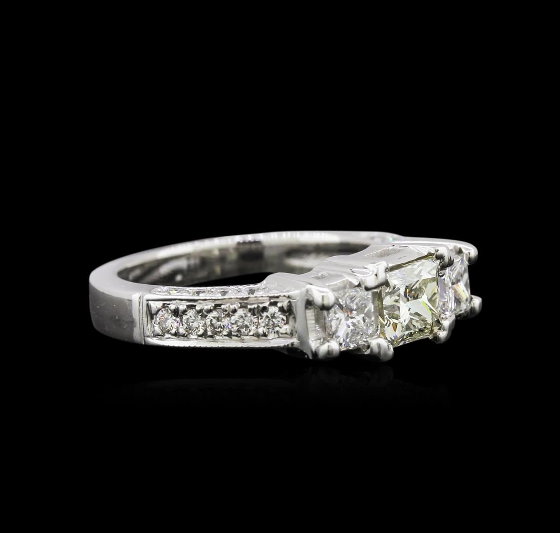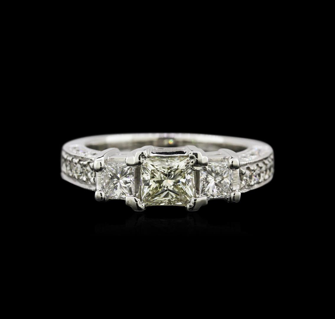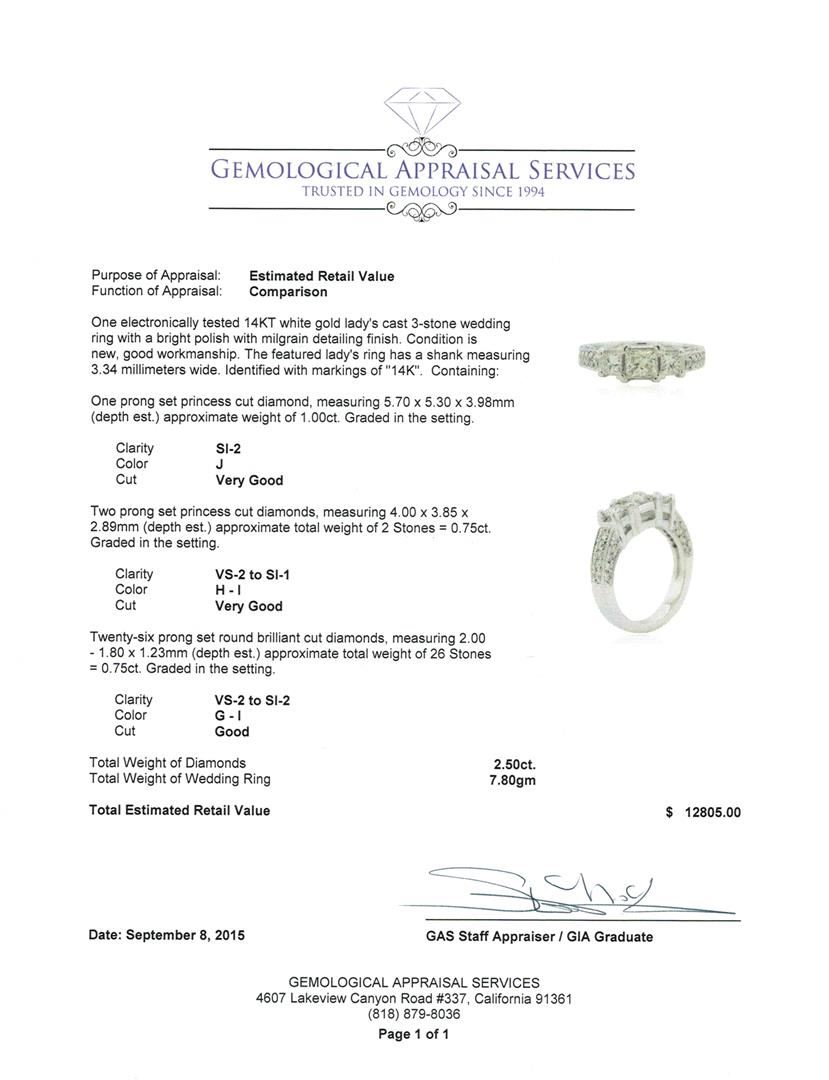 One electronically tested 14KT white gold lady's cast 3-stone wedding ring with a bright polish with milgrain detailing finish. The featured lady's ring has a shank measuring 3.34 millimeters wide. Identified with markings of "14K". Condition is new, good workmanship. Containing: One prong set princess cut diamond, measuring 5.70 x 5.30 x 3.98mm (depth est.) approximate weight of 1.00ct. Graded in the setting. Clarity: SI-2. Color: Very Good Two prong set princess cut diamonds, measuring 4.00 x 3.85 x 2.89mm (depth est.) approximate total weight of 2 Stones = 0.75ct. Graded in the setting. Clarity: VS-2 to SI-1. Color: H - I. Cut Very Good Twenty-Six prong set round brilliant cut diamonds, measuring 2.00 - 1.80 x 1.23mm (depth est.) approximate total weight of 26 Stones = 0.75ct. Graded in the setting. Clarity: VS-2 to SI-2. Color: G - I. Cut Good. Total Weight of Diamonds 2.50ct. Total Weight of Wedding Ring 7.80gm. GAS Appraised at $12,805.00.