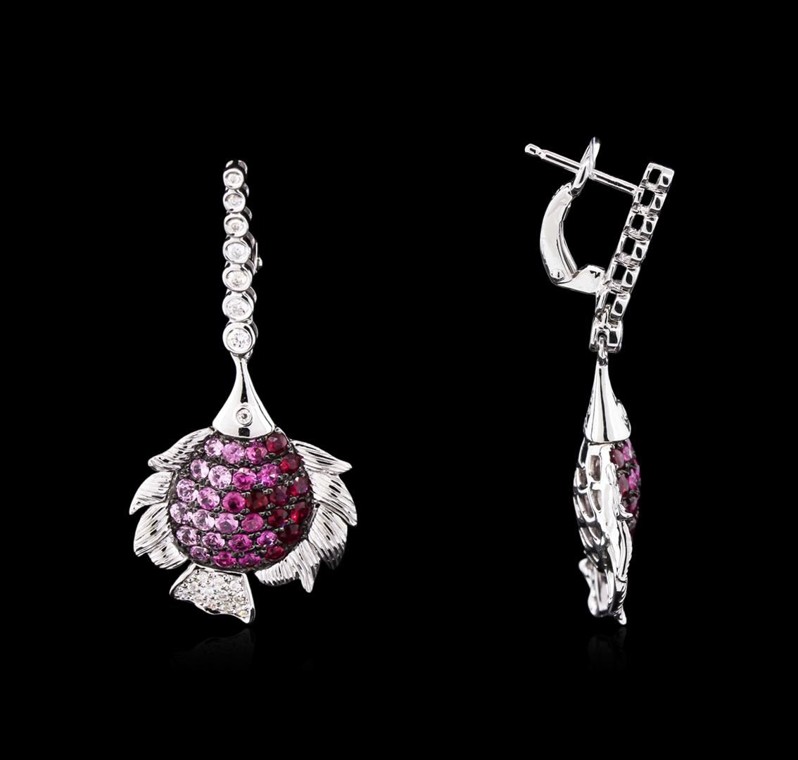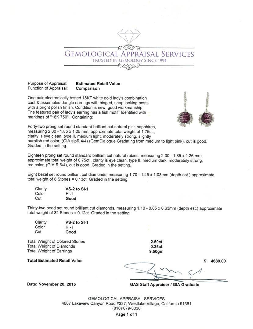 One pair electronically tested 18KT white gold lady's combination cast & assembled dangle earrings with hinged, snap locking posts with a bright polish finish. The featured pair of lady's earring has a fish motif. Identified with markings of "18K 750". Condition is new, good workmanship. Containing: Forty-two prong set round standard brilliant cut natural pink sapphires, measuring 2.00 - 1.85 x 1.25 mm, approximate total weight of 1.75ct., clarity is eye clean, type II, medium light, moderately strong, slightly purplish red color, (GIA slpR 4/4) (GemDialogue Gradating from medium to light pink), cut is good. Graded in the setting. Eighteen prong set round standard brilliant cut natural rubies, measuring 2.00 - 1.85 x 1.26 mm, approximate total weight of 0.75ct., clarity is eye clean, type II, medium dark, moderately strong, red color, (GIA R 6/4), cut is good. Graded in the setting. Eight bezel set round brilliant cut diamonds, measuring 1.70 - 1.45 x 1.03mm (depth est.) approximate total weight of 8 Stones = 0.13ct. Graded in the setting. Clarity: VS-2 to SI-1. Color: H - I. Cut Good Thirty-Two bead set round brilliant cut diamonds, measuring 1.10 - 0.85 x 0.63mm (depth est.) approximate total weight of 32 Stones = 0.12ct. Graded in the setting. Clarity: VS-2 to SI-1. Color: H - I. Cut Good. Total Weight of Colored Stones 2.50ct. Total Weight of Diamonds 0.25ct. Total Weight of Earrings 9.50gm. GAS Appraised at $4,680.00.