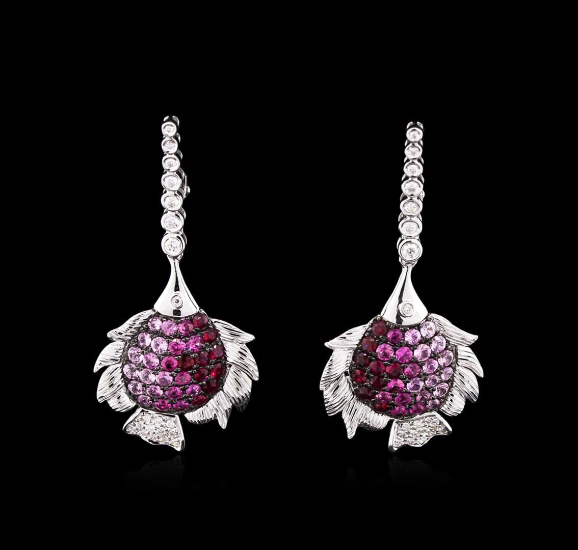 One pair electronically tested 18KT white gold lady's combination cast & assembled dangle earrings with hinged, snap locking posts with a bright polish finish. The featured pair of lady's earring has a fish motif. Identified with markings of "18K 750". Condition is new, good workmanship. Containing: Forty-two prong set round standard brilliant cut natural pink sapphires, measuring 2.00 - 1.85 x 1.25 mm, approximate total weight of 1.75ct., clarity is eye clean, type II, medium light, moderately strong, slightly purplish red color, (GIA slpR 4/4) (GemDialogue Gradating from medium to light pink), cut is good. Graded in the setting. Eighteen prong set round standard brilliant cut natural rubies, measuring 2.00 - 1.85 x 1.26 mm, approximate total weight of 0.75ct., clarity is eye clean, type II, medium dark, moderately strong, red color, (GIA R 6/4), cut is good. Graded in the setting. Eight bezel set round brilliant cut diamonds, measuring 1.70 - 1.45 x 1.03mm (depth est.) approximate total weight of 8 Stones = 0.13ct. Graded in the setting. Clarity: VS-2 to SI-1. Color: H - I. Cut Good Thirty-Two bead set round brilliant cut diamonds, measuring 1.10 - 0.85 x 0.63mm (depth est.) approximate total weight of 32 Stones = 0.12ct. Graded in the setting. Clarity: VS-2 to SI-1. Color: H - I. Cut Good. Total Weight of Colored Stones 2.50ct. Total Weight of Diamonds 0.25ct. Total Weight of Earrings 9.50gm. GAS Appraised at $4,680.00.