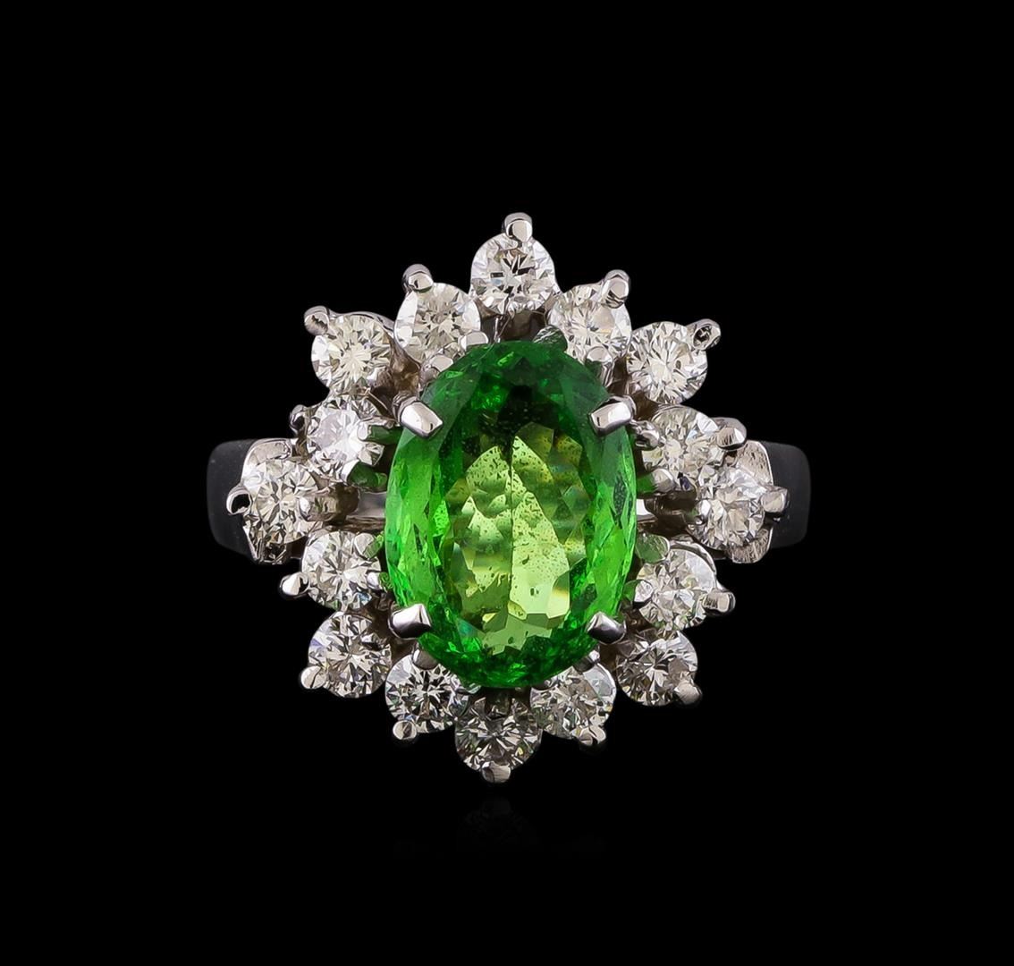 One electronically tested 14KT white gold lady's cast fashion ring with a basket halo with a bright polish finish. The featured lady's ring has a shank measuring 2.77 millimeters wide. Identified with markings of "14K". Condition is new, good workmanship. Containing: One prong set oval modified brilliant cut natural tsavorite garnet, measuring 9.69 x 7.00 x 3.89mm, (depth est.) 5%. bulge factor, approximate weight of 2.51ct., clarity is slightly included, medium, moderately strong, slightly yellowish green color, (GIA slyG 5/4), cut is good. Transmitting light with a minimum of distortion, transparent. Colored gemstones are presumed to have been subjected to commonly used enhancement processes. Graded in the setting. Sixteen prong set round brilliant cut diamonds, measuring 2.40 - 2.30 x 1.46mm (depth est.) approximate total weight of 16 Stones = 0.80 ct. Graded in the setting. Clarity: SI-1 to I-1. Color: G - Good. Total Weight of Colored Stones 2.51ct. Total Weight of Diamonds 0.80 ct. Total Weight of Ring 5.30gm. GAS Appraised.