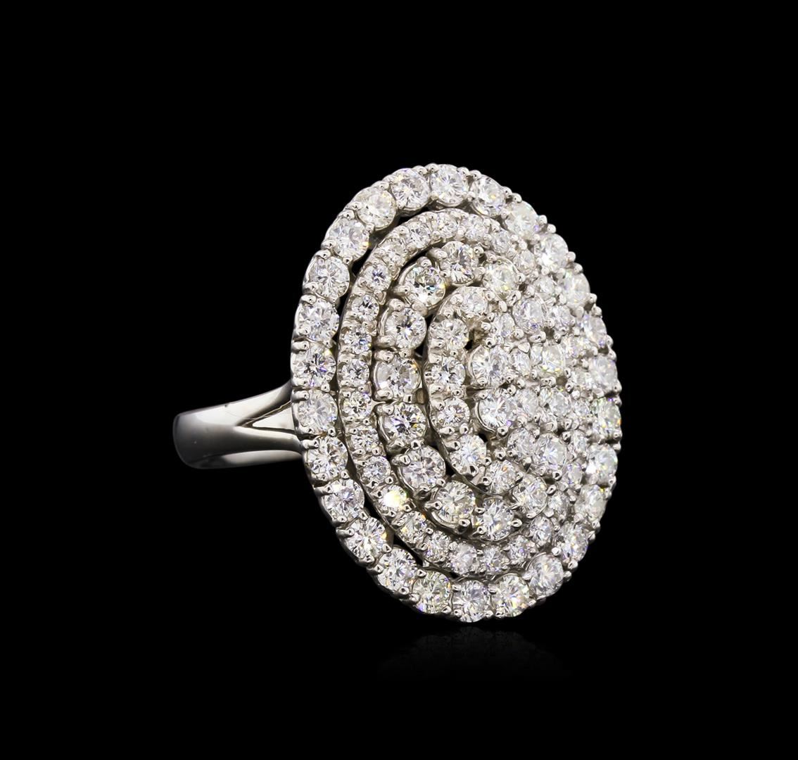 One electronically tested 14KT white gold lady's cast fashion ring with a basket halo with a bright polish finish. The featured ring has a shank measuring 3.70 millimeters in width. Identified with markings of "K14". Condition is new, good workmanship. Containing: Two prong set round brilliant cut diamonds, measuring 2.25 - 2.20 x 1.45mm (depth est.) approximate total weight of 2 Stones = 0.09ct. Graded in the setting. Clarity: SI-1. Color: Very Good Forty prong set round brilliant cut diamonds, measuring 2.30 - 2.20 x 1.46mm (depth est.) approximate total weight of 40 Stones = 1.80ct. Graded in the setting. Clarity: SI-1 to SI-2. Color: H - I. Cut Good Thirty-Eight prong set round brilliant cut diamonds, measuring 1.70 - 1.60 x 1.01mm (depth est.) approximate total weight of 38 Stones = 0.63ct. Graded in the setting. Clarity: SI-1 to SI-2. Color: H - I. Cut Good. Total Weight of Diamonds 2.52ct. Total Weight of Ring 8.90gm. GAS Appraised at $8,110.00.