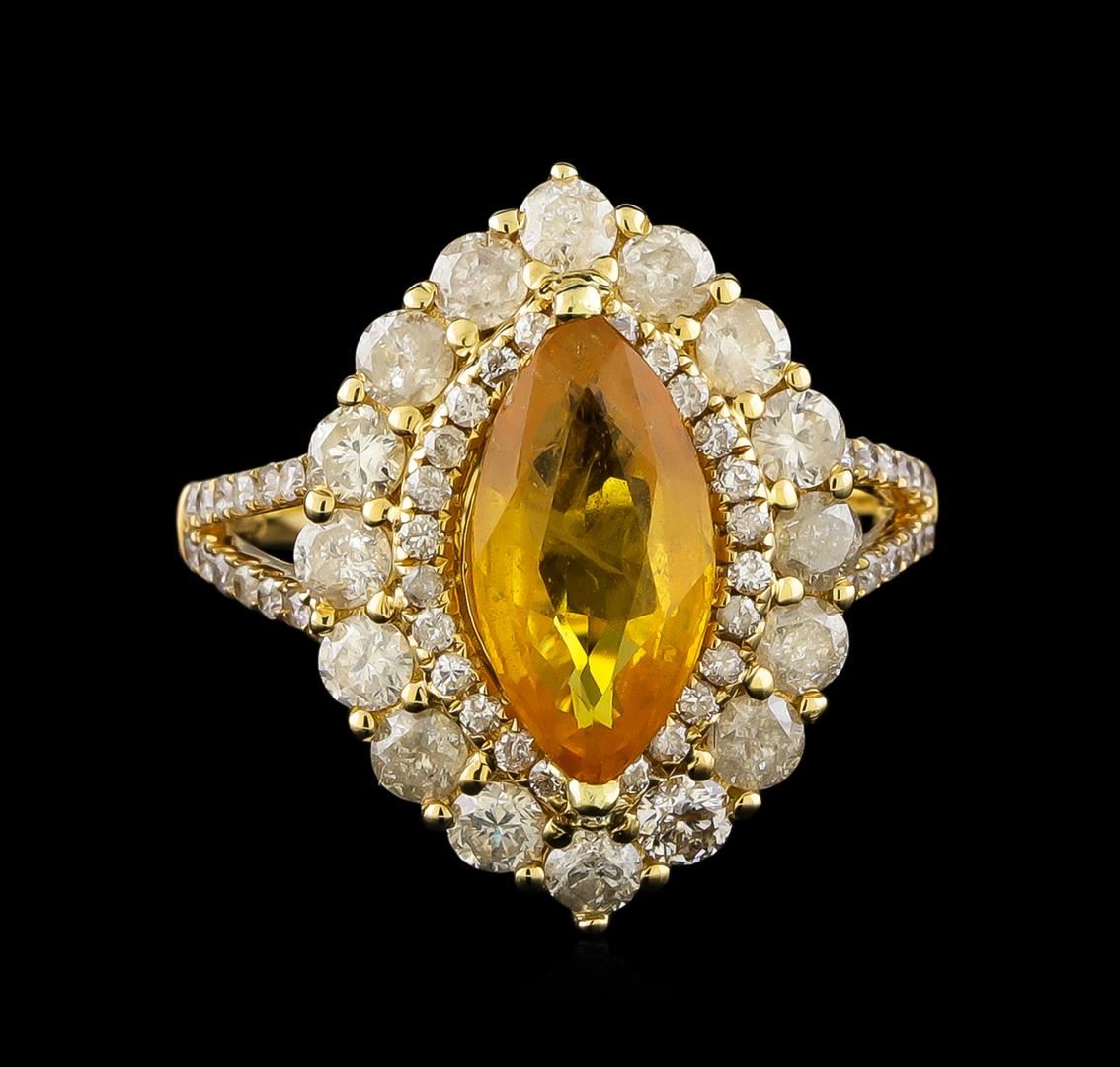One electronically tested 14KT white gold ladies cast yellow sapphire and diamond ring with a bright polish finish. The featured yellow sapphire is set within tiered diamond bezels supported by a ribbed under gallery and split diamond shoulders, completed by a one and one-half millimeter wide band. Trademark is Orianne. Identified with markings of "14K". Condition is new, good workmanship. Containing: One prong set marquise mixed cut natural yellow sapphire, measuring 12.70 x 6.30 x 3.50mm, 15%. bulge factor, approximate weight of 2.52ct., clarity is moderately included, type II, medium dark, slightly brownish, orangy yellow color, (GIA oY 6/2), cut is good. Transmitting light with a minimum of distortion, transparent. Naturally occurring internal & external characteristics are present. Graded in the setting. Sixteen prong set round brilliant cut diamonds, measuring 2.70 - 2.60 x 1.59mm (depth est.) approximate total weight of 16 Stones = 1.10ct. Graded in the setting. Clarity: I-1 to I-2. Color: H - I Fifty-Eight prong set round brilliant cut diamonds, measuring 1.20 - 1.10 x 0.69mm (depth est.) approximate total weight of 58 Stones = 0.37ct. Graded in the setting. Clarity: SI-2 to I-2. Color: G - I. Total Weight of Colored Stones 2.52ct. Total Weight of Diamonds 1.47ct. Total Weight of Ring 5.32gm. AIG Appraised at $7,085.00.