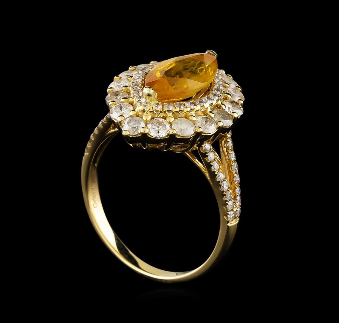 One electronically tested 14KT white gold ladies cast yellow sapphire and diamond ring with a bright polish finish. The featured yellow sapphire is set within tiered diamond bezels supported by a ribbed under gallery and split diamond shoulders, completed by a one and one-half millimeter wide band. Trademark is Orianne. Identified with markings of "14K". Condition is new, good workmanship. Containing: One prong set marquise mixed cut natural yellow sapphire, measuring 12.70 x 6.30 x 3.50mm, 15%. bulge factor, approximate weight of 2.52ct., clarity is moderately included, type II, medium dark, slightly brownish, orangy yellow color, (GIA oY 6/2), cut is good. Transmitting light with a minimum of distortion, transparent. Naturally occurring internal & external characteristics are present. Graded in the setting. Sixteen prong set round brilliant cut diamonds, measuring 2.70 - 2.60 x 1.59mm (depth est.) approximate total weight of 16 Stones = 1.10ct. Graded in the setting. Clarity: I-1 to I-2. Color: H - I Fifty-Eight prong set round brilliant cut diamonds, measuring 1.20 - 1.10 x 0.69mm (depth est.) approximate total weight of 58 Stones = 0.37ct. Graded in the setting. Clarity: SI-2 to I-2. Color: G - I. Total Weight of Colored Stones 2.52ct. Total Weight of Diamonds 1.47ct. Total Weight of Ring 5.32gm. AIG Appraised at $7,085.00.