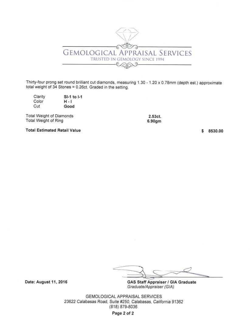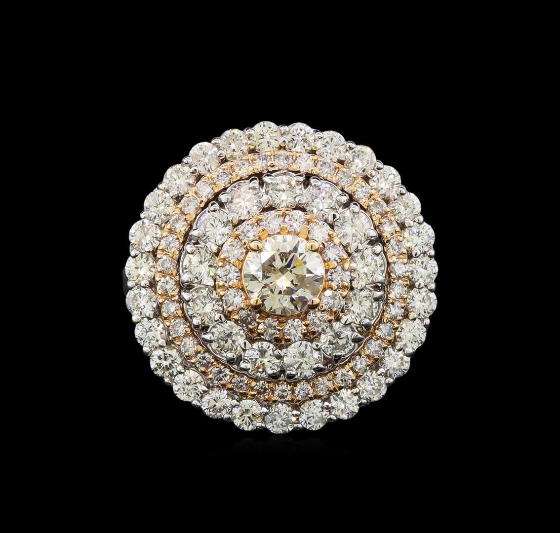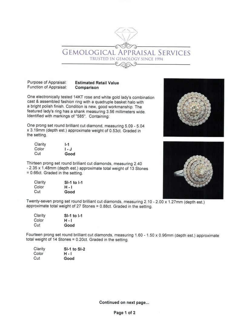 One electronically tested 14KT rose and white gold lady's combination cast & assembled fashion ring with a quadruple basket halo with a bright polish finish. The featured lady's ring has a shank measuring 3.56 millimeters wide. Identified with markings of '585'. Condition is new, good workmanship. Containing: One prong set round brilliant cut diamond, measuring 5.09 - 5.04 x 3.19mm (depth est.) approximate weight of 0.53ct. Graded in the setting. Clarity I-1. Color: I - J Cut Good Thirteen prong set round brilliant cut diamonds, measuring 2.40 - 2.35 x 1.48mm (depth est.) approximate total weight of 13 Stones = 0.66ct. Graded in the setting. Clarity SI-1 to I-1. Color: H - I Cut Good Twenty-Seven prong set round brilliant cut diamonds, measuring 2.10 - 2.00 x 1.27mm (depth est.) approximate total weight of 27 Stones = 0.88ct. Graded in the setting. Clarity SI-1 to I-1. Color: H - I Cut Good Fourteen prong set round brilliant cut diamonds, measuring 1.60 - 1.50 x 0.96mm (depth est.) approximate total weight of 14 Stones = 0.20ct. Graded in the setting. Clarity SI-1 to SI-2. Color: H - I Cut Good Thirty-Four prong set round brilliant cut diamonds, measuring 1.30 - 1.20 x 0.78mm (depth est.) approximate total weight of 34 Stones = 0.26ct. Graded in the setting. Clarity SI-1 to I-1. Color: H - I Cut Good. Total Weight of Diamonds 2.53ct.. Total Weight of Ring 6.90gm. GAS Appraised at $8,530.00.