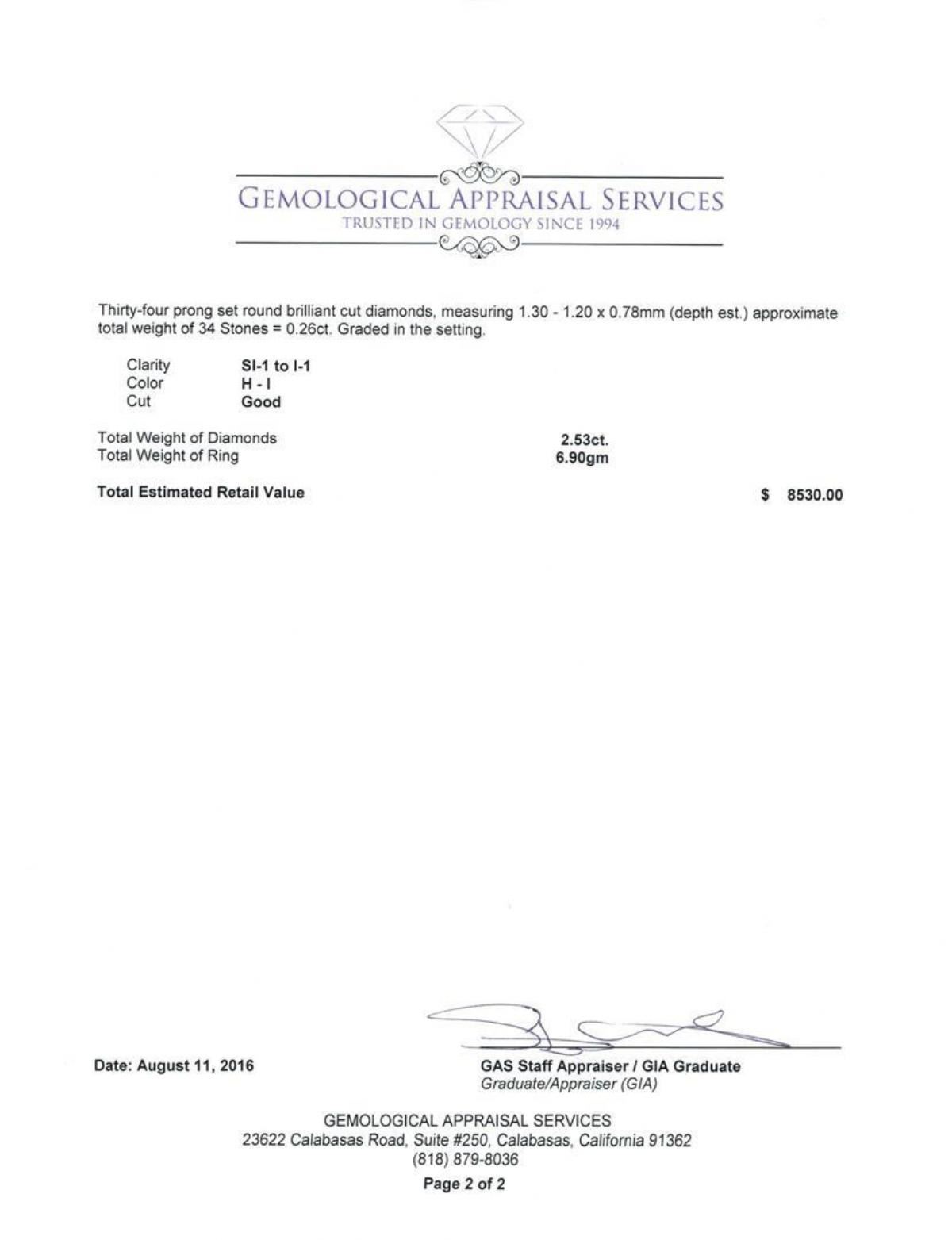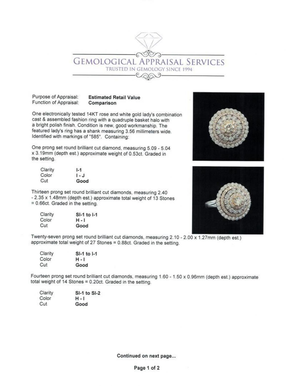 One electronically tested 14KT rose and white gold lady's combination cast & assembled fashion ring with a quadruple basket halo with a bright polish finish. The featured lady's ring has a shank measuring 3.56 millimeters wide. Identified with markings of '585'. Condition is new, good workmanship. Containing: One prong set round brilliant cut diamond, measuring 5.09 - 5.04 x 3.19mm (depth est.) approximate weight of 0.53ct. Graded in the setting. Clarity I-1. Color: I - J Cut Good Thirteen prong set round brilliant cut diamonds, measuring 2.40 - 2.35 x 1.48mm (depth est.) approximate total weight of 13 Stones = 0.66ct. Graded in the setting. Clarity SI-1 to I-1. Color: H - I Cut Good Twenty-Seven prong set round brilliant cut diamonds, measuring 2.10 - 2.00 x 1.27mm (depth est.) approximate total weight of 27 Stones = 0.88ct. Graded in the setting. Clarity SI-1 to I-1. Color: H - I Cut Good Fourteen prong set round brilliant cut diamonds, measuring 1.60 - 1.50 x 0.96mm (depth est.) approximate total weight of 14 Stones = 0.20ct. Graded in the setting. Clarity SI-1 to SI-2. Color: H - I Cut Good Thirty-Four prong set round brilliant cut diamonds, measuring 1.30 - 1.20 x 0.78mm (depth est.) approximate total weight of 34 Stones = 0.26ct. Graded in the setting. Clarity SI-1 to I-1. Color: H - I Cut Good. Total Weight of Diamonds 2.53ct.. Total Weight of Ring 6.90gm. GAS Appraised.