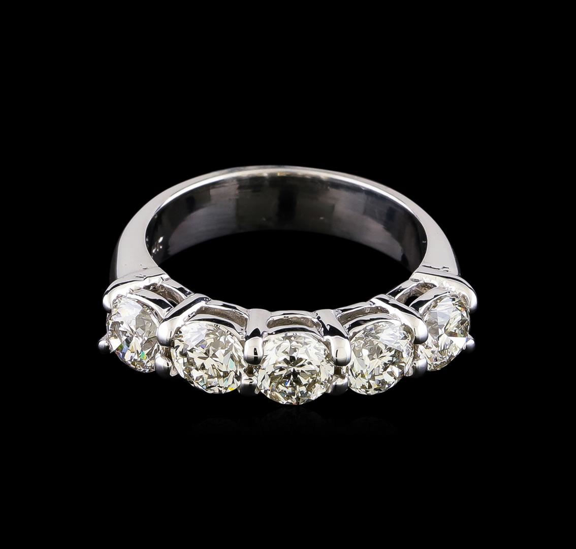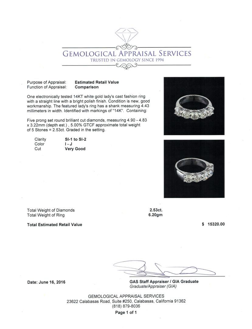 One electronically tested 14KT white gold lady's cast fashion ring with a straight line with a bright polish finish. The featured lady's ring has a shank measuring 4.43 millimeters in width. Identified with markings of "14K". Condition is new, good workmanship. Containing: Five prong set round brilliant cut diamonds, measuring 4.90 - 4.83 x 3.22mm (depth est.) , 5.00.%. GTCF approximate total weight of 5 Stones = 2.53ct. Graded in the setting. Clarity: SI-1 to SI-2. Color: I - Very Good. Total Weight of Diamonds 2.53ct. Total Weight of Ring 6.20gm GAS Appraised at $15,320.00.