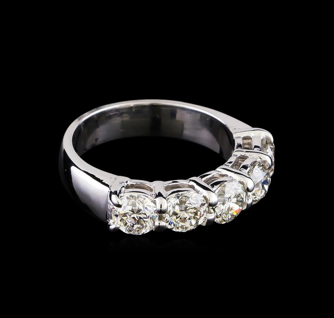 One electronically tested 14KT white gold lady's cast fashion ring with a straight line with a bright polish finish. The featured lady's ring has a shank measuring 4.43 millimeters in width. Identified with markings of "14K". Condition is new, good workmanship. Containing: Five prong set round brilliant cut diamonds, measuring 4.90 - 4.83 x 3.22mm (depth est.) , 5.00.%. GTCF approximate total weight of 5 Stones = 2.53ct. Graded in the setting. Clarity: SI-1 to SI-2. Color: I - Very Good. Total Weight of Diamonds 2.53ct. Total Weight of Ring 6.20gm GAS Appraised at $15,320.00.
