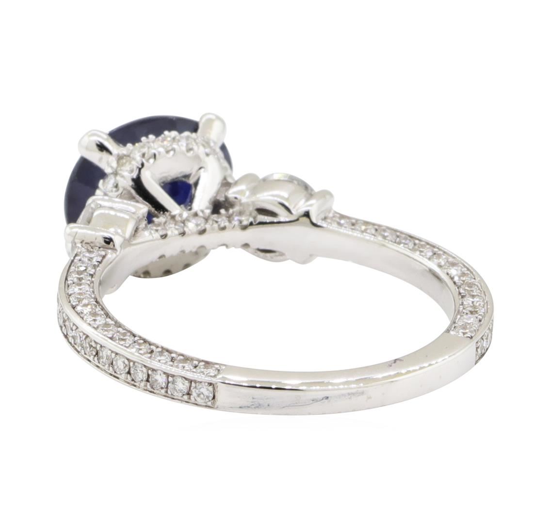 One electronically tested 14KT white gold lady's cast fashion ring with a straight line three stone motif with a bright polish finish. The featured lady's ring has a shank measuring 1.60 millimeters wide. Identified with markings of '14K'. Condition is new, good workmanship. Containing: One prong set oval modified mixed cut natural blue sapphire, measuring 8.05 x 7.04 x 3.70mm, (depth est.) approximate weight of 1.73ct., clarity is moderately included, medium dark, very slightly grayish, blue color, (GIA B 6/3), cut is very good. Transmitting light somewhat diffusely, transparent to translucent. Colored gemstones are presumed to have been subjected to commonly used enhancement processes. Graded in the setting. Two prong set round brilliant cut diamonds, measuring 3.55 - 3.50 x 2.19mm (depth est.) approximate total weight of 2 Stones = 0.34ct. Graded in the setting. Color H - I Clarity SI-1 to SI-2 Cut Very Good One Hundred Six prong set round brilliant cut diamonds, measuring 1.10 - 1.00 x 0.65mm (depth est.) approximate total weight of 106 Stones = 0.46ct. Graded in the setting. Color G - H Clarity VS-2 to SI-2 Cut Very Good. Total Weight of Colored Stones 1.73ct.. Total Weight of Diamonds 0.80 ct.. Total Weight of Ring 2.80gm GAS Appraised at $4755.00. GAS Appraised.