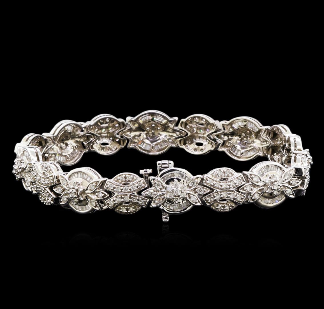 One electronically tested 14KT white gold lady's combination cast & assembled fashion bracelet with a tongue clasp with foldover safety with a bright polish finish. The featured lady's bracelet measures approximately 7 inches in length. Identified with markings of "14K". Condition is new, good workmanship. Containing: One Hundred Thirty-Six channel set baguette cut (tapered) diamonds, measuring from 1.00 x 0.80 x 0.68mm (depth est.) to 1.20 x 0.90 x 0.77mm (depth est.) approximate total weight of 136 Stones = 0.85ct. Graded in the setting. Clarity: SI-2 to I-1. Color: G - Good Fifty-Six prong set round brilliant cut diamonds, measuring 1.20 - 1.10 x 0.72mm (depth est.) approximate total weight of 56 Stones = 0.33ct. Graded in the setting. Clarity: SI-2 to I-1. Color: G - Good One Hundred Sixty prong set round brilliant cut diamonds, measuring 1.40 - 1.20 x 0.81mm (depth est.) approximate total weight of 160 Stones = 1.35ct. Graded in the setting. Clarity: SI-2 to I-1. Color: G - Good. Total Weight of Diamonds 2.53ct. Total Weight of Bracelet 20.70gm. GAS Appraised at $10,025.00.