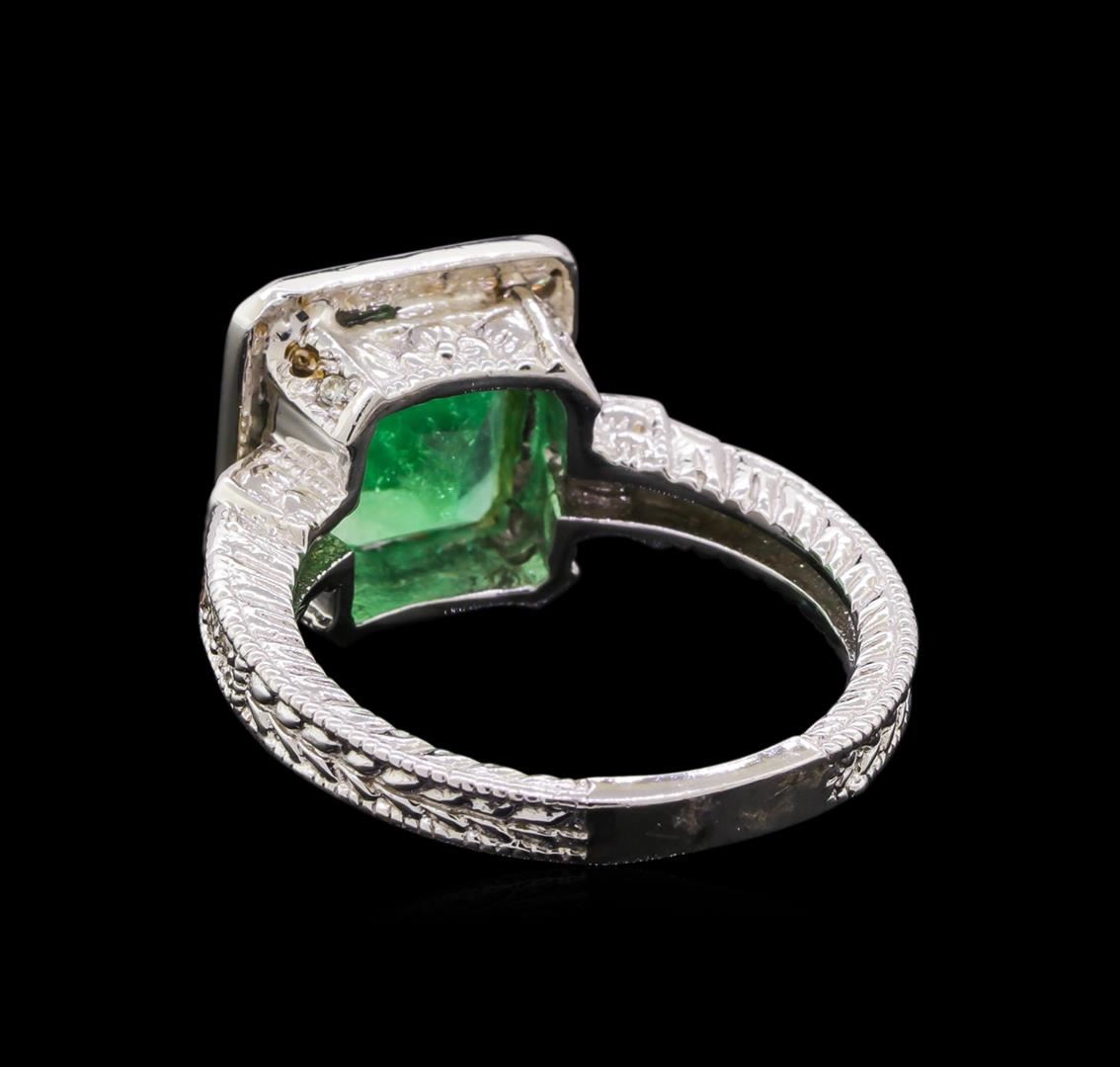 One electronically tested 14KT white gold lady's cast fashion ring with a bright polish finish. The featured lady's ring features milgrain and hand engraved detailing and has a shank measuring 2.73 millimeters wide. Identified with markings of '14K'. Condition is new, good workmanship. Containing: One bezel set emerald step cut natural emerald, measuring 8.03 x 7.70 x 5.44mm, (depth est.) 3%. bulge factor, approximate weight of 2.54ct., clarity is heavily included, medium light, moderately strong, green color, (GIA G 4/4), cut is good. Transmitting light somewhat diffusely, semi-transparent to translucent. Indications of oil residue. Naturally occurring internal & external characteristics are present. Colored gemstones are presumed to have been subjected to commonly used enhancement processes. Graded in the setting. Two channel set round brilliant cut diamonds, measuring 2.00 - 1.95 x 1.23mm (depth est.) approximate total weight of 2 Stones = 0.06ct. Graded in the setting. Clarity SI-1 to SI-2. Color: H - I Cut Good Twenty-Eight prong set round brilliant cut diamonds, measuring 1.40 - 1.30 x 0.84mm (depth est.) approximate total weight of 28 Stones = 0.26ct. Graded in the setting. Clarity SI-2 to I-2. Color: H - I Cut Good Eight prong set round brilliant cut diamonds, measuring 1.00 - 0.95 x 0.61mm (depth est.) approximate total weight of 8 Stones = 0.03ct. Graded in the setting. Clarity SI-1 to I-1. Color: H - I Cut Good. Total Weight of Colored Stones 2.54ct.. Total Weight of Diamonds 0.35ct.. Total Weight of Ring 5.50gm. GAS Appraised at $4,365.00.