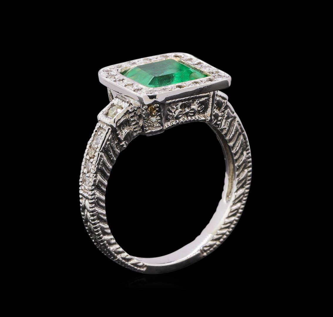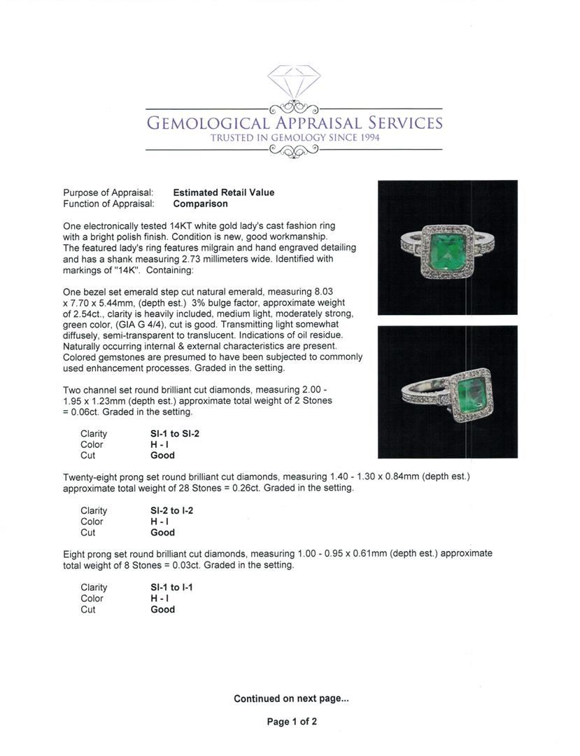 One electronically tested 14KT white gold lady's cast fashion ring with a bright polish finish. The featured lady's ring features milgrain and hand engraved detailing and has a shank measuring 2.73 millimeters wide. Identified with markings of '14K'. Condition is new, good workmanship. Containing: One bezel set emerald step cut natural emerald, measuring 8.03 x 7.70 x 5.44mm, (depth est.) 3%. bulge factor, approximate weight of 2.54ct., clarity is heavily included, medium light, moderately strong, green color, (GIA G 4/4), cut is good. Transmitting light somewhat diffusely, semi-transparent to translucent. Indications of oil residue. Naturally occurring internal & external characteristics are present. Colored gemstones are presumed to have been subjected to commonly used enhancement processes. Graded in the setting. Two channel set round brilliant cut diamonds, measuring 2.00 - 1.95 x 1.23mm (depth est.) approximate total weight of 2 Stones = 0.06ct. Graded in the setting. Clarity SI-1 to SI-2. Color: H - I Cut Good Twenty-Eight prong set round brilliant cut diamonds, measuring 1.40 - 1.30 x 0.84mm (depth est.) approximate total weight of 28 Stones = 0.26ct. Graded in the setting. Clarity SI-2 to I-2. Color: H - I Cut Good Eight prong set round brilliant cut diamonds, measuring 1.00 - 0.95 x 0.61mm (depth est.) approximate total weight of 8 Stones = 0.03ct. Graded in the setting. Clarity SI-1 to I-1. Color: H - I Cut Good. Total Weight of Colored Stones 2.54ct.. Total Weight of Diamonds 0.35ct.. Total Weight of Ring 5.50gm. GAS Appraised at $4,365.00.
