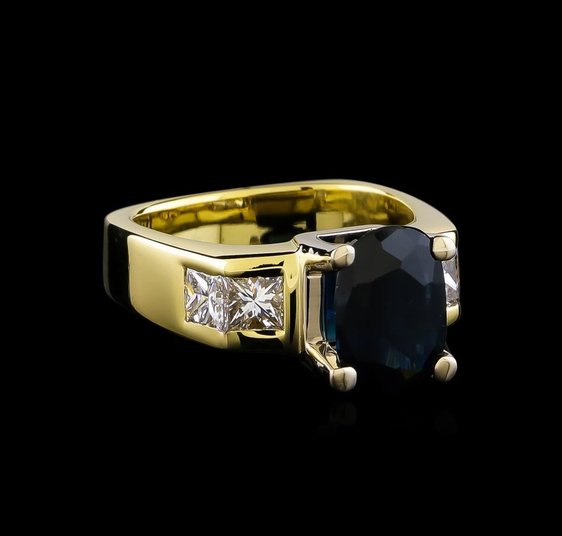 One electronically tested 18KT yellow gold ladies cast sapphire and diamond ring. The featured sapphire is supported by mirroring diamond set shoulders tapering into a four and one-half millimeter wide pipe-cut band. Bright polish finish with rhodium accents. Identified with markings of "18K". Condition is good. Containing: One prong set oval mixed cut natural blue sapphire, measuring 10.30 x 7.30 x 3.90mm, approximate weight of 2.54ct., clarity is slightly included, type II, very dark, moderately strong, blue color, (GIA B 8/4), cut is good. Transmitting light with a minimum of distortion, transparent. Naturally occurring internal & external characteristics are present. Graded in the setting. Four channel set princess cut diamonds, measuring 3.60 x 3.50 x 2.70mm (depth est.) approximate total weight of 4 Stones = 1.20ct. Clarity: VVS-2 to VS-2. Color: F - G. Total Weight of Colored Stones 2.54ct. Total Weight of Diamonds 1.20ct. Total Weight of Ring 10.14gm. AIG Appraised at $11,820.00.