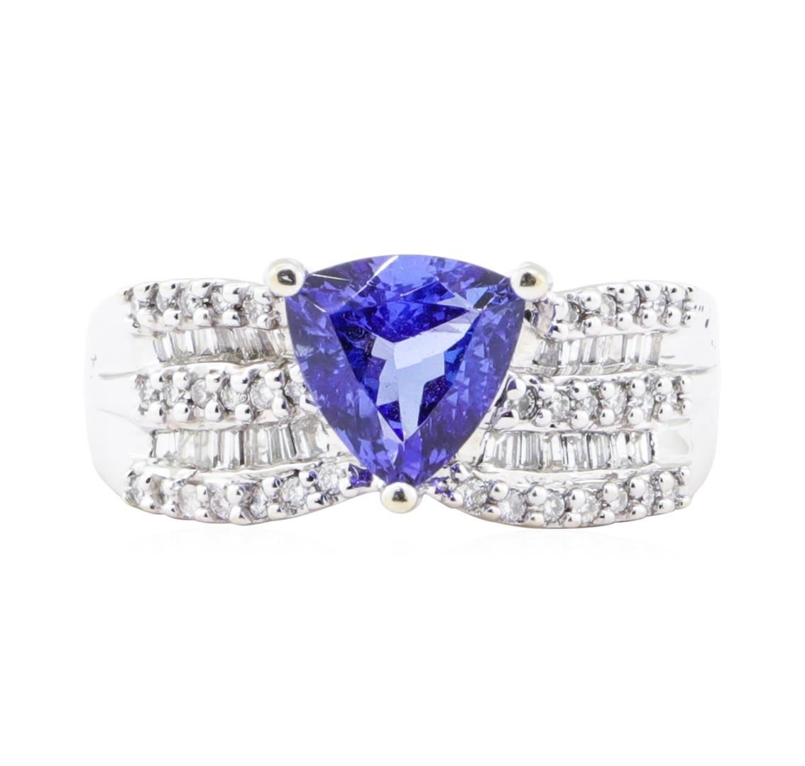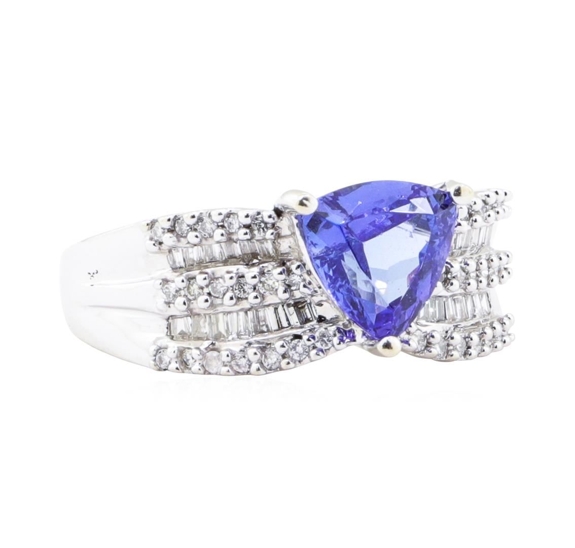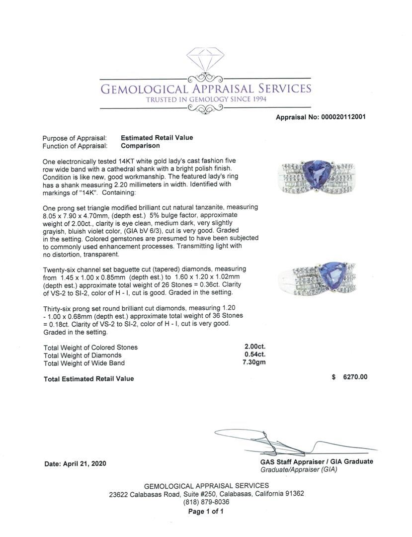 One electronically tested 14KT white gold lady's cast fashion five row wide band with a cathedral shank with a bright polish finish. The featured lady's ring has a shank measuring 2.20 millimeters in width. Identified with markings of '14K'. Condition is Good. Containing: One prong set triangle modified brilliant cut natural tanzanite, measuring 8.05 x 7.90 x 4.70mm, (depth est.) 5%. bulge factor, approximate weight of 2.00 ct., clarity is eye clean, medium dark, very slightly grayish, bluish violet color, (GIA bV 6/3), cut is very good. Graded in the setting. Colored gemstones are presumed to have been subjected to commonly used enhancement processes. Transmitting light with no distortion, transparent. Twenty-Six channel set baguette cut (tapered) diamonds, measuring from 1.45 x 1.00 x 0.85mm (depth est.) to 1.60 x 1.20 x 1.02mm (depth est.) approximate total weight of 26 Stones = 0.36ct. Graded in the setting. Color H - I Clarity VS-2 to SI-2 Cut Good Thirty-Six prong set round brilliant cut diamonds, measuring 1.20 - 1.00 x 0.68mm (depth est.) approximate total weight of 36 Stones = 0.18ct. Graded in the setting. Color H - I Clarity VS-2 to SI-2 Cut Very Good. Total Weight of Colored Stones 2.00 ct.. Total Weight of Diamonds 0.54ct.. Total Weight of Wide Band 7.30gm GAS Appraised at $6270.00. GAS Appraised.