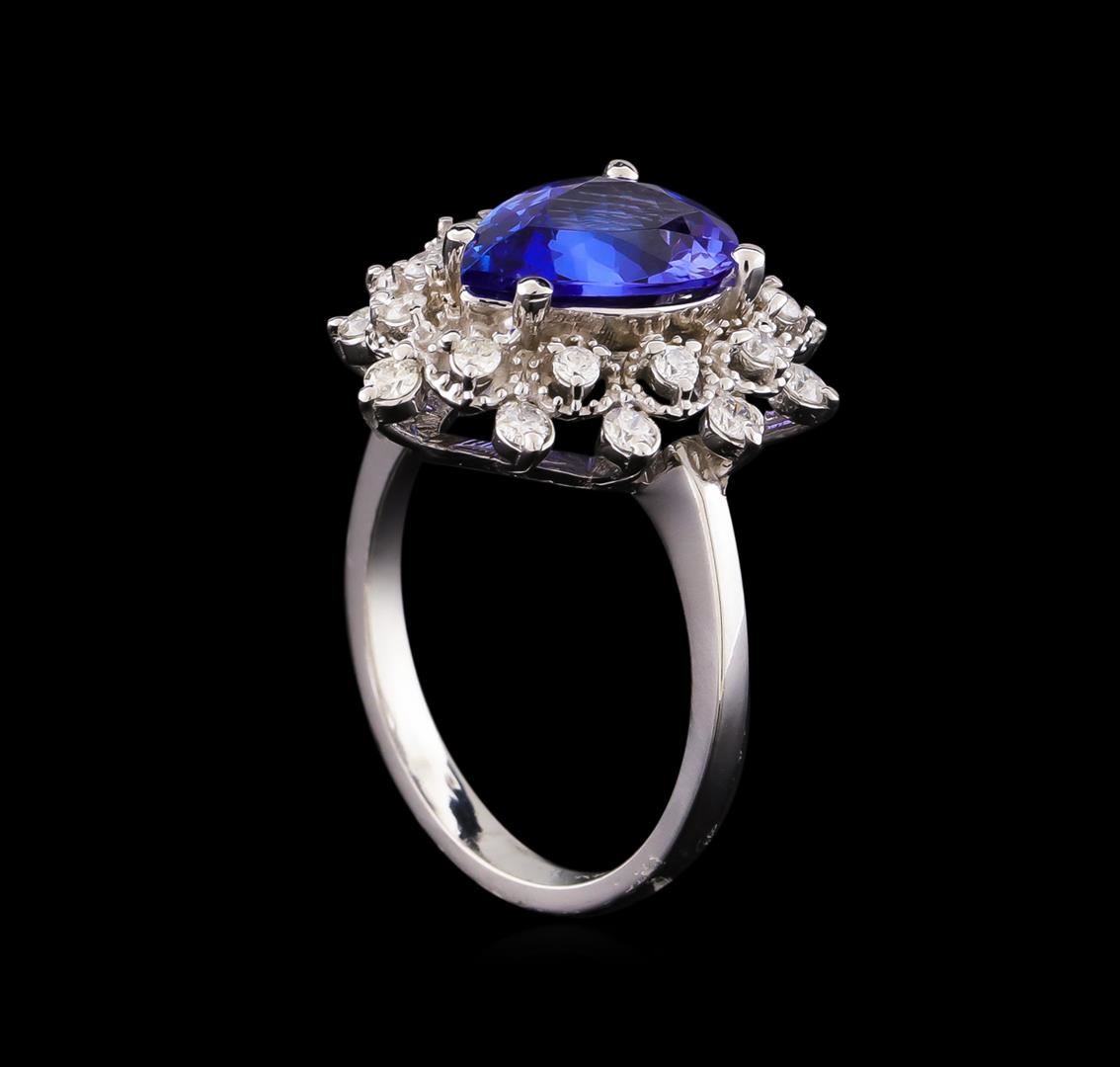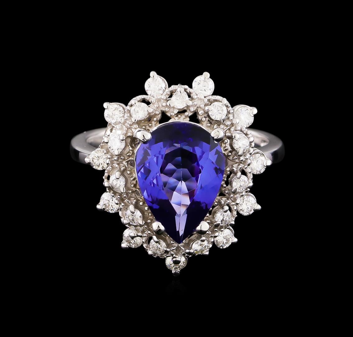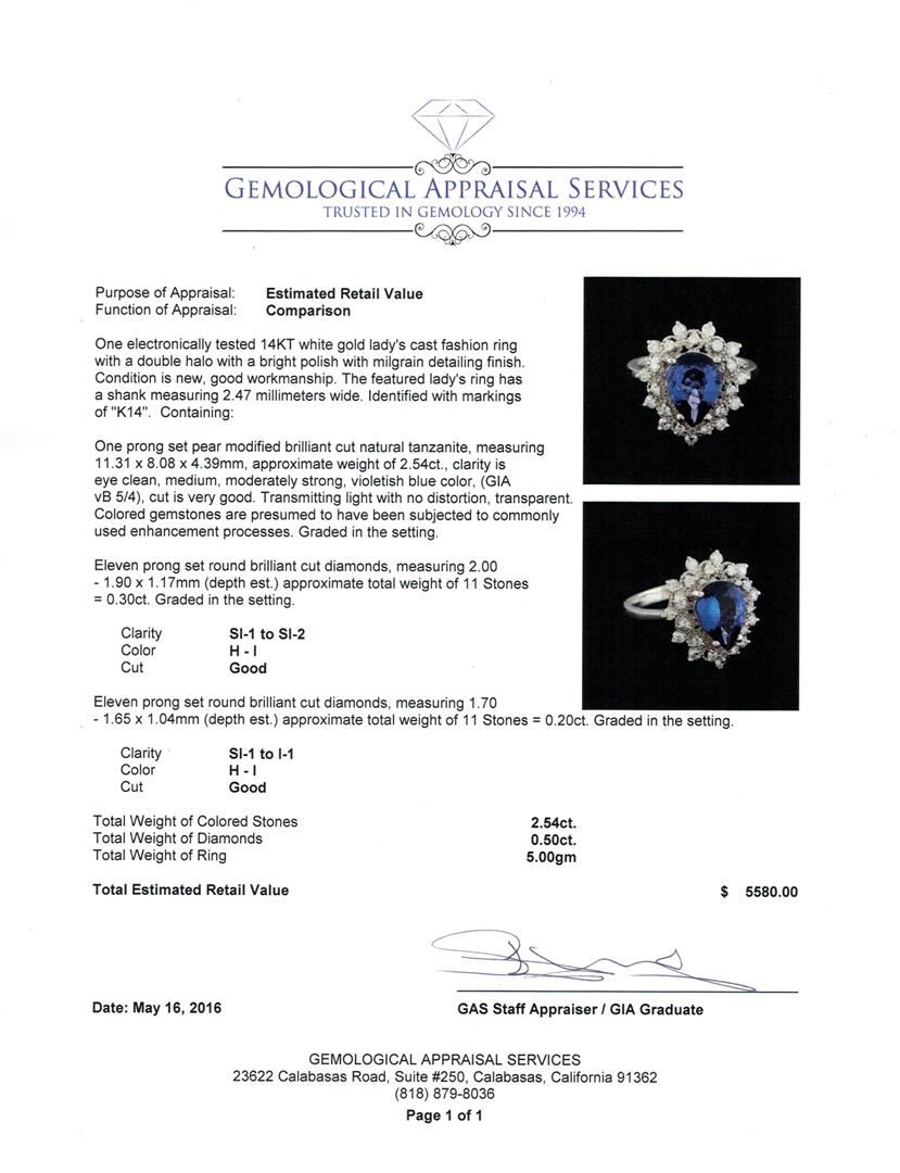 One electronically tested 14KT white gold lady's cast fashion ring with a double halo with a bright polish with milgrain detailing finish. The featured lady's ring has a shank measuring 2.47 millimeters wide. Identified with markings of "K14". Condition is new, good workmanship. Containing: One prong set pear modified brilliant cut natural tanzanite, measuring 11.31 x 8.08 x 4.39mm, approximate weight of 2.54ct., clarity is eye clean, medium, moderately strong, violetish blue color, (GIA vB 5/4), cut is very good. Transmitting light with no distortion, transparent. Colored gemstones are presumed to have been subjected to commonly used enhancement processes. Graded in the setting. Eleven prong set round brilliant cut diamonds, measuring 2.00 - 1.90 x 1.17mm (depth est.) approximate total weight of 11 Stones = 0.30ct. Graded in the setting. Clarity: SI-1 to SI-2. Color: H - I. Cut Good Eleven prong set round brilliant cut diamonds, measuring 1.70 - 1.65 x 1.04mm (depth est.) approximate total weight of 11 Stones = 0.20ct. Graded in the setting. Clarity: SI-1 to I-1. Color: H - I. Cut Good. Total Weight of Colored Stones 2.54ct. Total Weight of Diamonds 0.50ct. Total Weight of Ring 5.00gm. GAS Appraised at $5,580.00.