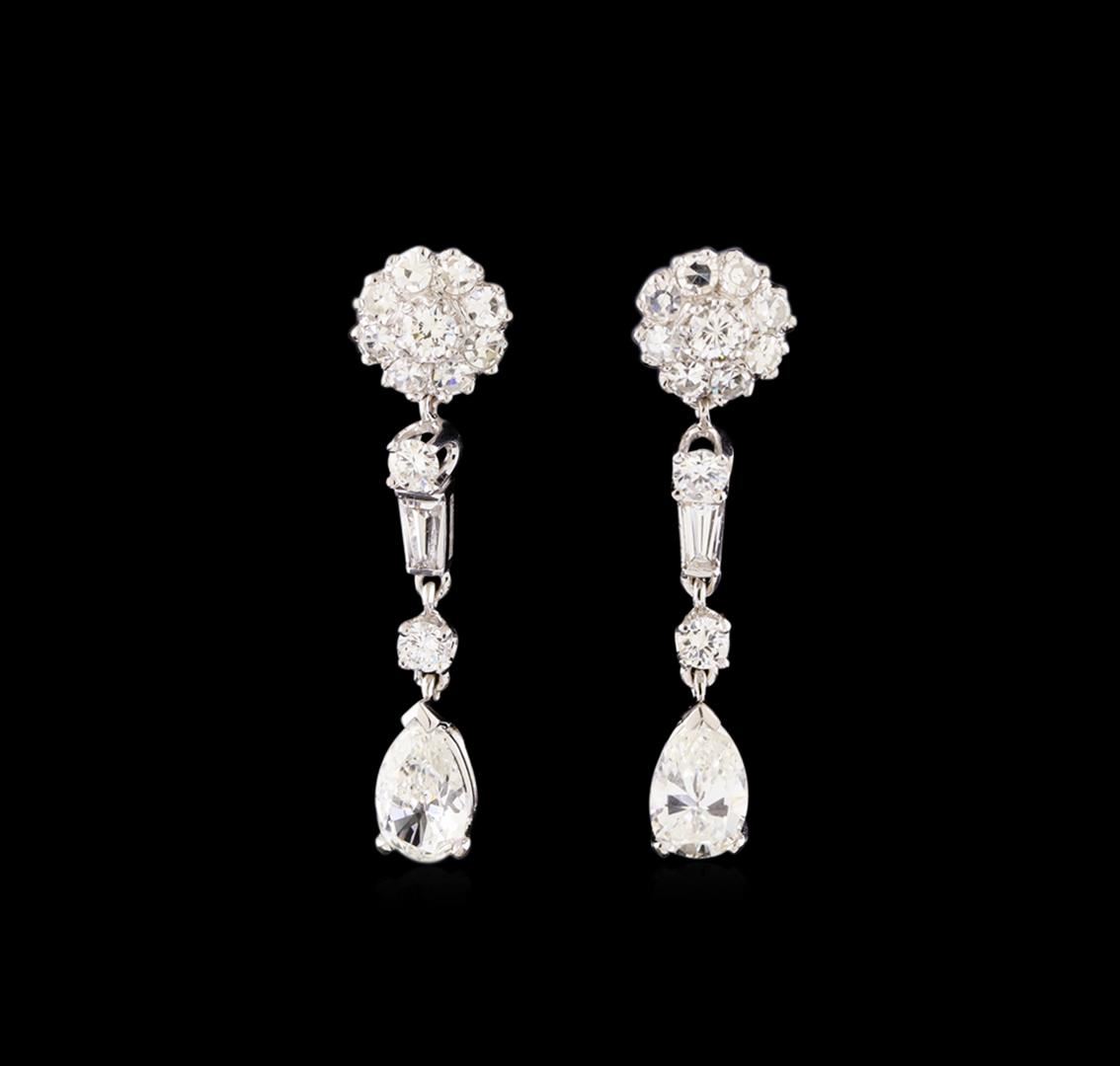 One electronically tested 14KT white gold ladies cast & assembled diamond dangle earrings with screw backs. Each earring features a flexible diamond ribbon drop suspended by a diamond floret post. Bright polish finish. Condition is good. Containing: Two prong set pear shaped cut diamonds, measuring 8.00 x 5.00 x 2.50mm (depth est.) approximate total weight of 2 Stones = 1.25ct. Measurements are an average for the pair. Graded in the setting. Clarity VVS-2 to VS-1. Color: G Two prong set baguette cut (tapered) diamonds, measuring 4.00 x 1.80 x 1.26mm (depth est.) approximate total weight of 2 Stones = 0.15ct. Graded in the setting. Clarity VS-2 to SI-1. Color: F - G Six prong set round brilliant cut diamonds, measuring 2.90 - 2.80 x 1.71mm (depth est.) approximate total weight of 6 Stones = 0.51ct. Graded in the setting. Clarity VS-1 to SI-2. Color: G - I Sixteen prong set single cut diamonds, measuring 2.30 - 2.10 x 1.32mm (depth est.) approximate total weight of 16 Stones = 0.64ct. The color grade reflects the entire range of color for this group. Graded in the setting. Clarity SI-1 to I-1. Color: F - I. Total Weight of Diamonds 2.55ct.. Total Weight of Earrings 4.11gm. AIG Appraised at $13,295.00.