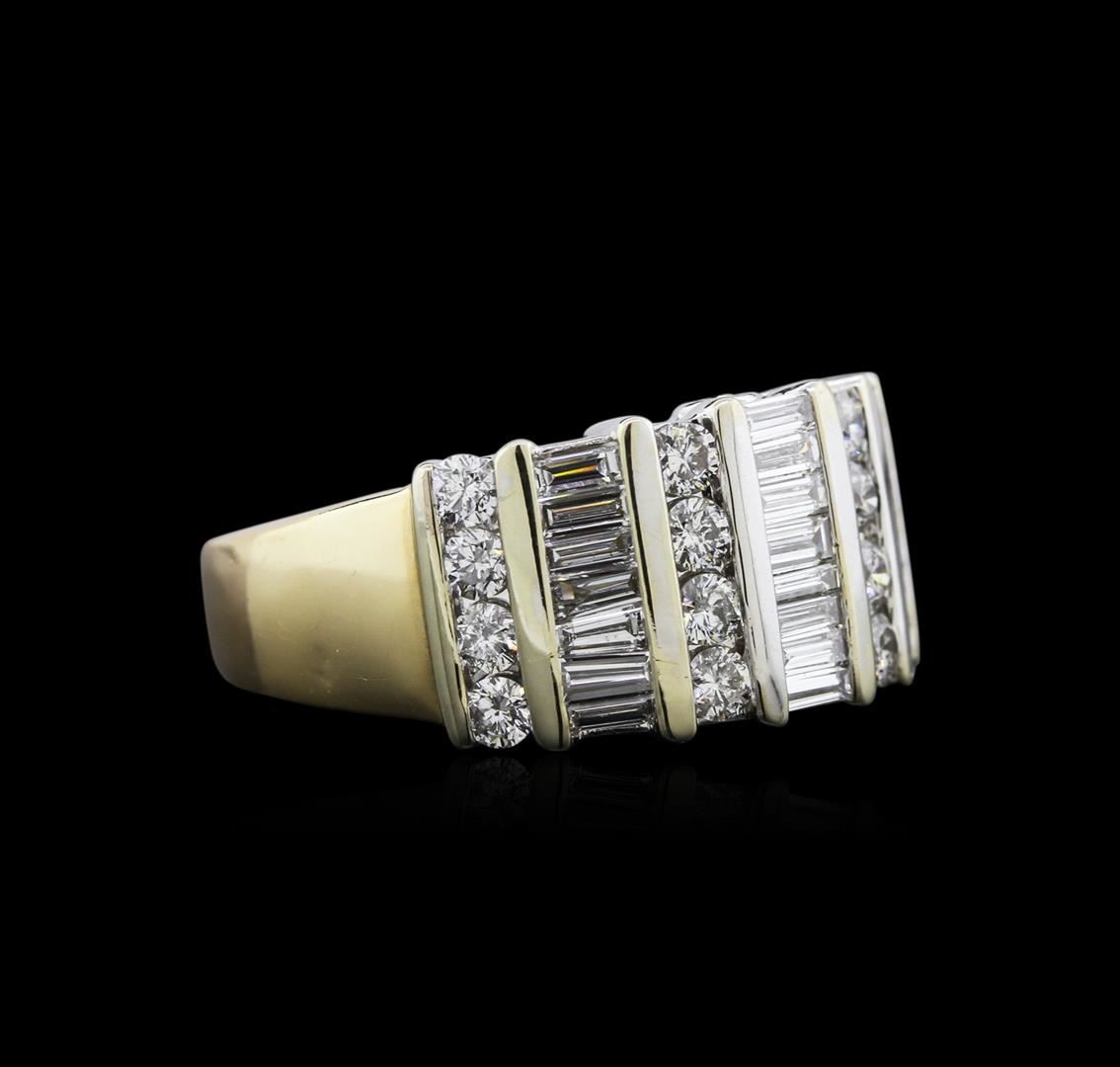 One electronically tested 14KT yellow gold ladies cast diamond ring with a bright polish finish. Identified with markings of "14K". Condition is very good. Containing: Sixteen prong set round brilliant cut diamonds, measuring 2.40 - 2.40 x 1.44mm (depth est.) approximate total weight of 16 Stones = 0.81ct. Clarity: SI-1 to SI-2. Color: G - H, Cut is Good. Twenty-Two channel set baguette cut diamonds, measuring 3.50 x 1.70 x 1.45mm (depth est.) approximate total weight of 22 Stones = 1.74ct. Clarity: VS-1 to VS-2. Color: H - I, Cut is Good. Diamonds are graded in the mounting, unless otherwise stated. Total Weight of Diamonds 2.55ct. Total Weight of Ring 11.40 grams. GGL Appraised at $6,695.00.