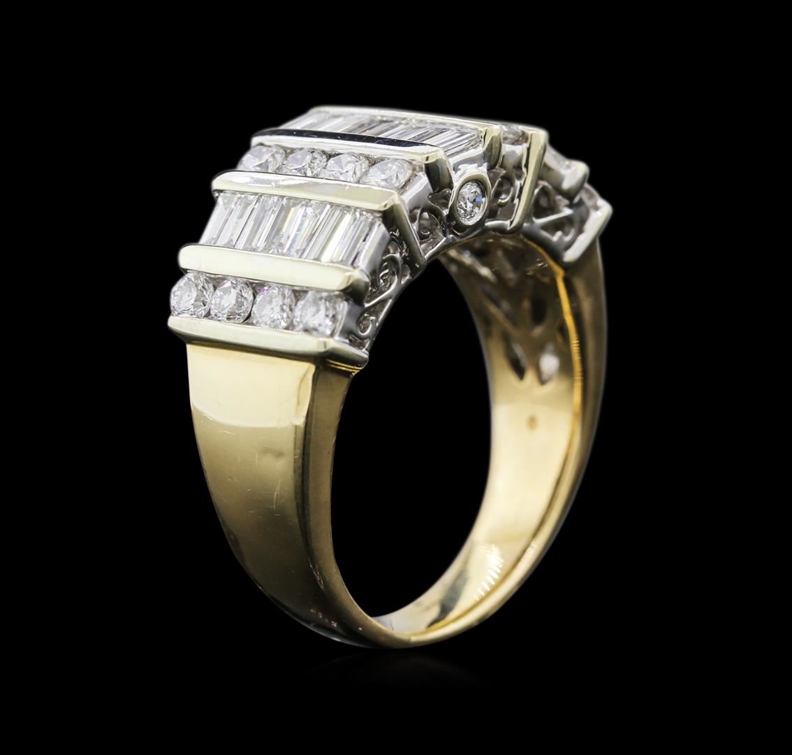 One electronically tested 14KT yellow gold ladies cast diamond ring with a bright polish finish. Identified with markings of "14K". Condition is very good. Containing: Sixteen prong set round brilliant cut diamonds, measuring 2.40 - 2.40 x 1.44mm (depth est.) approximate total weight of 16 Stones = 0.81ct. Clarity: SI-1 to SI-2. Color: G - H, Cut is Good. Twenty-Two channel set baguette cut diamonds, measuring 3.50 x 1.70 x 1.45mm (depth est.) approximate total weight of 22 Stones = 1.74ct. Clarity: VS-1 to VS-2. Color: H - I, Cut is Good. Diamonds are graded in the mounting, unless otherwise stated. Total Weight of Diamonds 2.55ct. Total Weight of Ring 11.40 grams. GGL Appraised at $6,695.00.