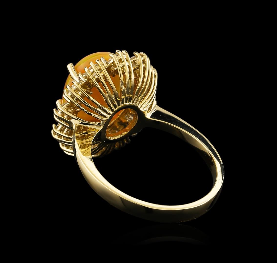 One electronically tested 14KT yellow gold lady's cast fashion ring with a double basket halo with a bright polish finish. The featured lady's ring has a shank measuring 2.61 millimeters wide. Identified with markings of "K14". Condition is new, good workmanship. Containing: One orange crystal that is cut in a oval shaped cabochon and is prong set, measuring 11.91 mm long x 9.73 mm wide, and 5.12 mm thick and the approximate weight is 2.55 carats. The opal has a somewhat bright, orange-green play of color (fire) in a rolling flashfire pattern; a medium dome; a good cut; no inclusions; consistent in its brightness and pattern; and is not directional. Graded in the setting. Twelve prong set round brilliant cut diamonds, measuring 2.90 - 2.80 x 1.71mm (depth est.) approximate total weight of 12 Stones = 1.01ct. Graded in the setting. Clarity: SI-1 to I-1. Color: G - Very Good Twelve prong set round brilliant cut diamonds, measuring 1.60 - 1.50 x 0.93mm (depth est.) approximate total weight of 12 Stones = 0.16ct. Graded in the setting. Clarity: SI-1 to I-1. Color: G - Good. Total Weight of Diamonds 1.17ct. Total Weight of Opals 2.55ct. Total Weight of Ring 5.60gm.