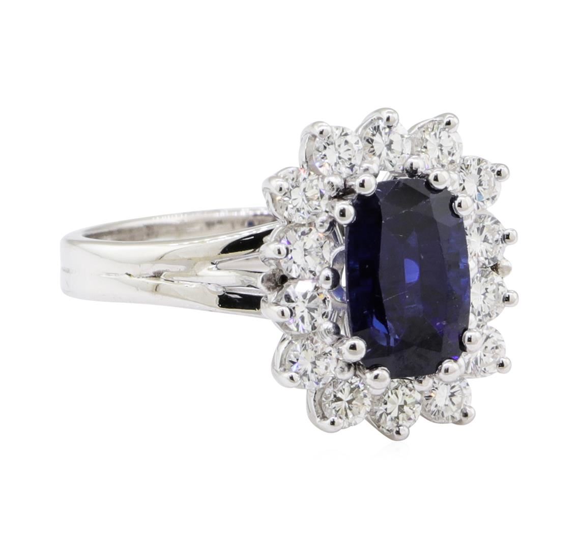 One electronically tested 14KT white gold lady's cast fashion ring with a wire basket halo with a bright polish finish. The featured lady's ring has a double shank measuring 2.60 millimeters wide. Identified with markings of '14K'. Condition is new, good workmanship. Containing: One prong set rectangular cushion modified mixed cut natural blue sapphire, measuring 8.36 x 5.62 x 3.95mm, (depth est.) 5%. bulge factor, approximate weight of 1.85ct., clarity is eye clean, medium dark, strong, very slightly greenish blue color, (GIA vslgB 6/5), cut is good. Transmitting light with no distortion, transparent. Colored gemstones are presumed to have been subjected to commonly used enhancement processes. Graded in the setting. Fourteen prong set round brilliant cut diamonds, measuring 2.40 - 2.30 x 1.46mm (depth est.) approximate total weight of 14 Stones = 0.70 ct. Graded in the setting. Color G - H Clarity VS-1 to VS-2 Cut Very Good. Total Weight of Colored Stones 1.85ct.. Total Weight of Diamonds 0.70 ct.. Total Weight of Ring 4.80gm GAS Appraised at $6685.00. GAS Appraised.
