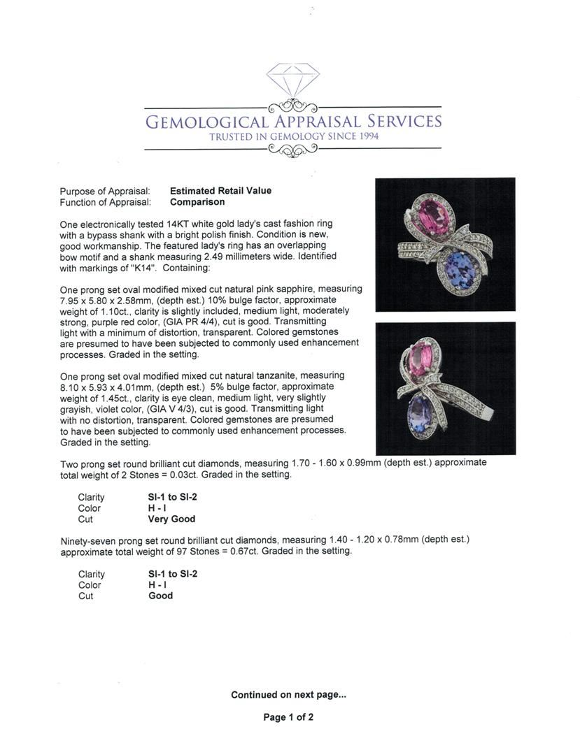 One electronically tested 14KT white gold lady's cast fashion ring with a bypass shank with a bright polish finish. The featured lady's ring has an overlapping bow motif and a shank measuring 2.49 millimeters wide. Identified with markings of 'K14'. Condition is new, good workmanship. Containing: One prong set oval modified mixed cut natural pink sapphire, measuring 7.95 x 5.80 x 2.58mm, (depth est.) 10%. bulge factor, approximate weight of 1.10ct., clarity is slightly included, medium light, moderately strong, purple red color, (GIA PR 4/4), cut is good. Transmitting light with a minimum of distortion, transparent. Colored gemstones are presumed to have been subjected to commonly used enhancement processes. Graded in the setting. One prong set oval modified mixed cut natural tanzanite, measuring 8.10 x 5.93 x 4.01mm, (depth est.) 5%. bulge factor, approximate weight of 1.45ct., clarity is eye clean, medium light, very slightly grayish, violet color, (GIA V 4/3), cut is good. Transmitting light with no distortion, transparent. Colored gemstones are presumed to have been subjected to commonly used enhancement processes. Graded in the setting. Two prong set round brilliant cut diamonds, measuring 1.70 - 1.60 x 0.99mm (depth est.) approximate total weight of 2 Stones = 0.03ct. Graded in the setting. Clarity SI-1 to SI-2. Color: H - I Cut Very Good Ninety-Seven prong set round brilliant cut diamonds, measuring 1.40 - 1.20 x 0.78mm (depth est.) approximate total weight of 97 Stones = 0.67ct. Graded in the setting. Clarity SI-1 to SI-2. Color: H - I Cut Good. Total Weight of Colored Stones 2.55ct.. Total Weight of Diamonds 0.70ct.. Total Weight of Ring 6.20gm. GAS Appraised at $5,875.00.