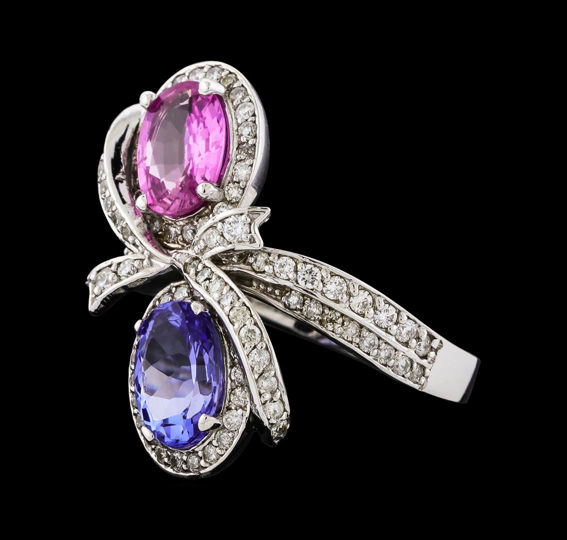 One electronically tested 14KT white gold lady's cast fashion ring with a bypass shank with a bright polish finish. The featured lady's ring has an overlapping bow motif and a shank measuring 2.49 millimeters wide. Identified with markings of 'K14'. Condition is new, good workmanship. Containing: One prong set oval modified mixed cut natural pink sapphire, measuring 7.95 x 5.80 x 2.58mm, (depth est.) 10%. bulge factor, approximate weight of 1.10ct., clarity is slightly included, medium light, moderately strong, purple red color, (GIA PR 4/4), cut is good. Transmitting light with a minimum of distortion, transparent. Colored gemstones are presumed to have been subjected to commonly used enhancement processes. Graded in the setting. One prong set oval modified mixed cut natural tanzanite, measuring 8.10 x 5.93 x 4.01mm, (depth est.) 5%. bulge factor, approximate weight of 1.45ct., clarity is eye clean, medium light, very slightly grayish, violet color, (GIA V 4/3), cut is good. Transmitting light with no distortion, transparent. Colored gemstones are presumed to have been subjected to commonly used enhancement processes. Graded in the setting. Two prong set round brilliant cut diamonds, measuring 1.70 - 1.60 x 0.99mm (depth est.) approximate total weight of 2 Stones = 0.03ct. Graded in the setting. Clarity SI-1 to SI-2. Color: H - I Cut Very Good Ninety-Seven prong set round brilliant cut diamonds, measuring 1.40 - 1.20 x 0.78mm (depth est.) approximate total weight of 97 Stones = 0.67ct. Graded in the setting. Clarity SI-1 to SI-2. Color: H - I Cut Good. Total Weight of Colored Stones 2.55ct.. Total Weight of Diamonds 0.70ct.. Total Weight of Ring 6.20gm. GAS Appraised at $5,875.00.