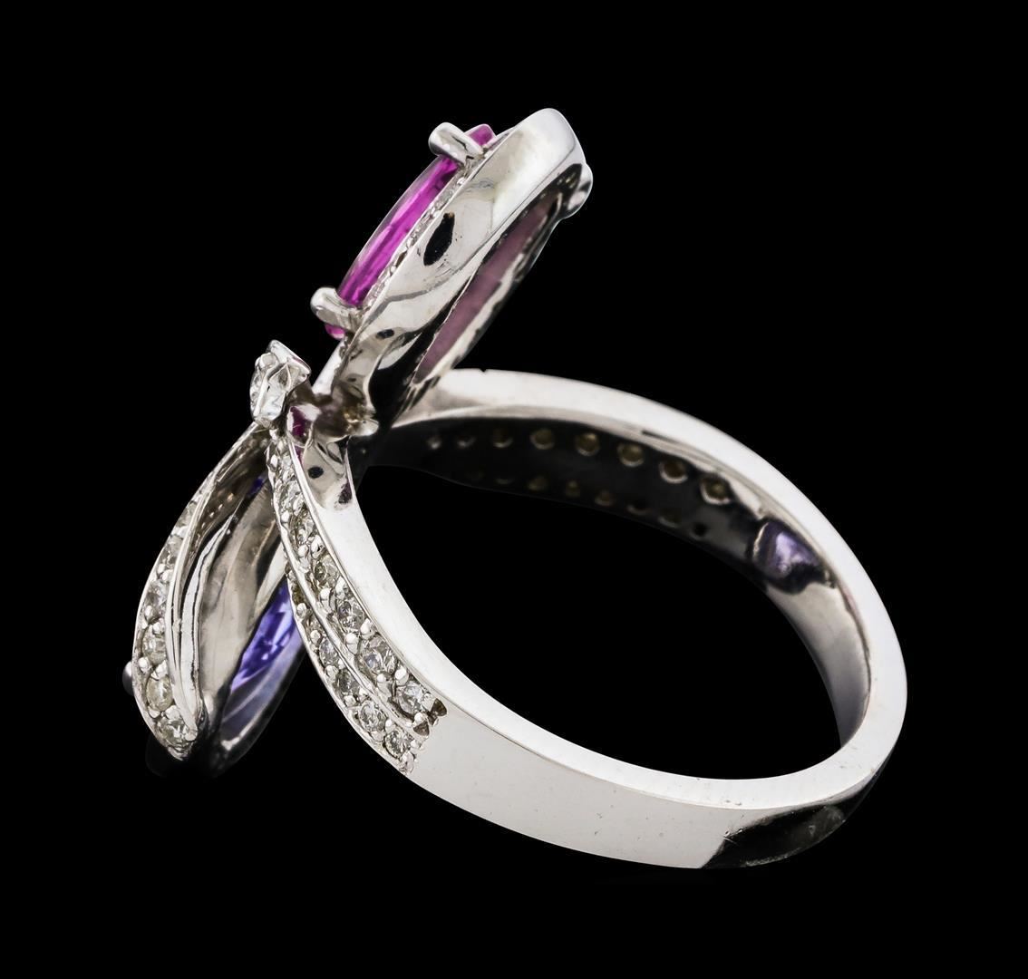One electronically tested 14KT white gold lady's cast fashion ring with a bypass shank with a bright polish finish. The featured lady's ring has an overlapping bow motif and a shank measuring 2.49 millimeters wide. Identified with markings of 'K14'. Condition is new, good workmanship. Containing: One prong set oval modified mixed cut natural pink sapphire, measuring 7.95 x 5.80 x 2.58mm, (depth est.) 10%. bulge factor, approximate weight of 1.10 ct., clarity is slightly included, medium light, moderately strong, purple red color, (GIA PR 4/4), cut is good. Transmitting light with a minimum of distortion, transparent. Colored gemstones are presumed to have been subjected to commonly used enhancement processes. Graded in the setting. One prong set oval modified mixed cut natural tanzanite, measuring 8.10 x 5.93 x 4.01mm, (depth est.) 5%. bulge factor, approximate weight of 1.45ct., clarity is eye clean, medium light, very slightly grayish, violet color, (GIA V 4/3), cut is good. Transmitting light with no distortion, transparent. Colored gemstones are presumed to have been subjected to commonly used enhancement processes. Graded in the setting. Two prong set round brilliant cut diamonds, measuring 1.70 - 1.60 x 0.99mm (depth est.) approximate total weight of 2 Stones = 0.03ct. Graded in the setting. Clarity SI-1 to SI-2. Color: H - I Cut Very Good Ninety-Seven prong set round brilliant cut diamonds, measuring 1.40 - 1.20 x 0.78mm (depth est.) approximate total weight of 97 Stones = 0.67ct. Graded in the setting. Clarity SI-1 to SI-2. Color: H - I Cut Good. Total Weight of Colored Stones 2.55ct.. Total Weight of Diamonds 0.70 ct.. Total Weight of Ring 6.20gm. GAS Appraised.