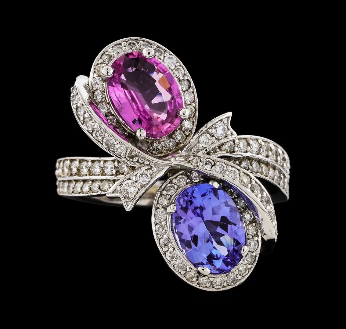 One electronically tested 14KT white gold lady's cast fashion ring with a bypass shank with a bright polish finish. The featured lady's ring has an overlapping bow motif and a shank measuring 2.49 millimeters wide. Identified with markings of 'K14'. Condition is new, good workmanship. Containing: One prong set oval modified mixed cut natural pink sapphire, measuring 7.95 x 5.80 x 2.58mm, (depth est.) 10%. bulge factor, approximate weight of 1.10 ct., clarity is slightly included, medium light, moderately strong, purple red color, (GIA PR 4/4), cut is good. Transmitting light with a minimum of distortion, transparent. Colored gemstones are presumed to have been subjected to commonly used enhancement processes. Graded in the setting. One prong set oval modified mixed cut natural tanzanite, measuring 8.10 x 5.93 x 4.01mm, (depth est.) 5%. bulge factor, approximate weight of 1.45ct., clarity is eye clean, medium light, very slightly grayish, violet color, (GIA V 4/3), cut is good. Transmitting light with no distortion, transparent. Colored gemstones are presumed to have been subjected to commonly used enhancement processes. Graded in the setting. Two prong set round brilliant cut diamonds, measuring 1.70 - 1.60 x 0.99mm (depth est.) approximate total weight of 2 Stones = 0.03ct. Graded in the setting. Clarity SI-1 to SI-2. Color: H - I Cut Very Good Ninety-Seven prong set round brilliant cut diamonds, measuring 1.40 - 1.20 x 0.78mm (depth est.) approximate total weight of 97 Stones = 0.67ct. Graded in the setting. Clarity SI-1 to SI-2. Color: H - I Cut Good. Total Weight of Colored Stones 2.55ct.. Total Weight of Diamonds 0.70 ct.. Total Weight of Ring 6.20gm. GAS Appraised.