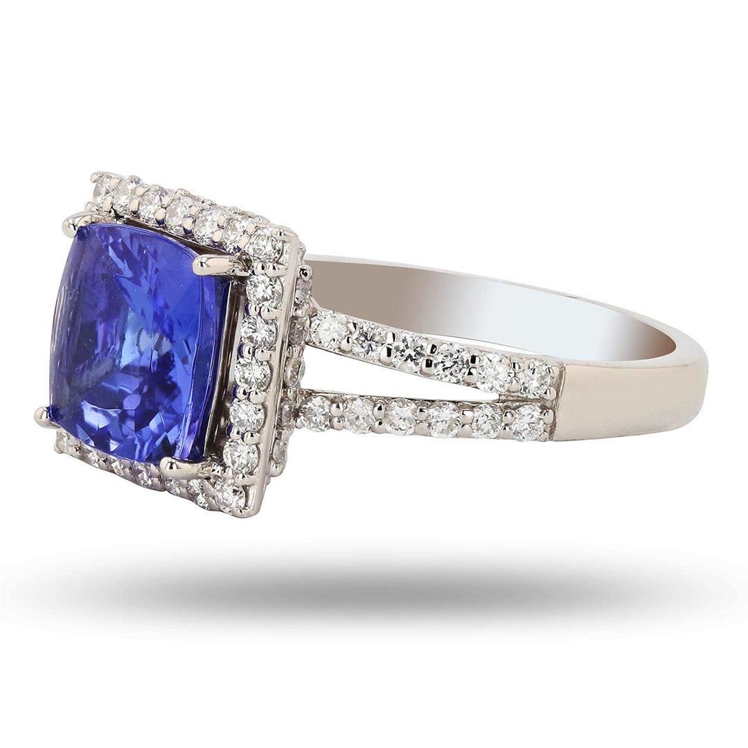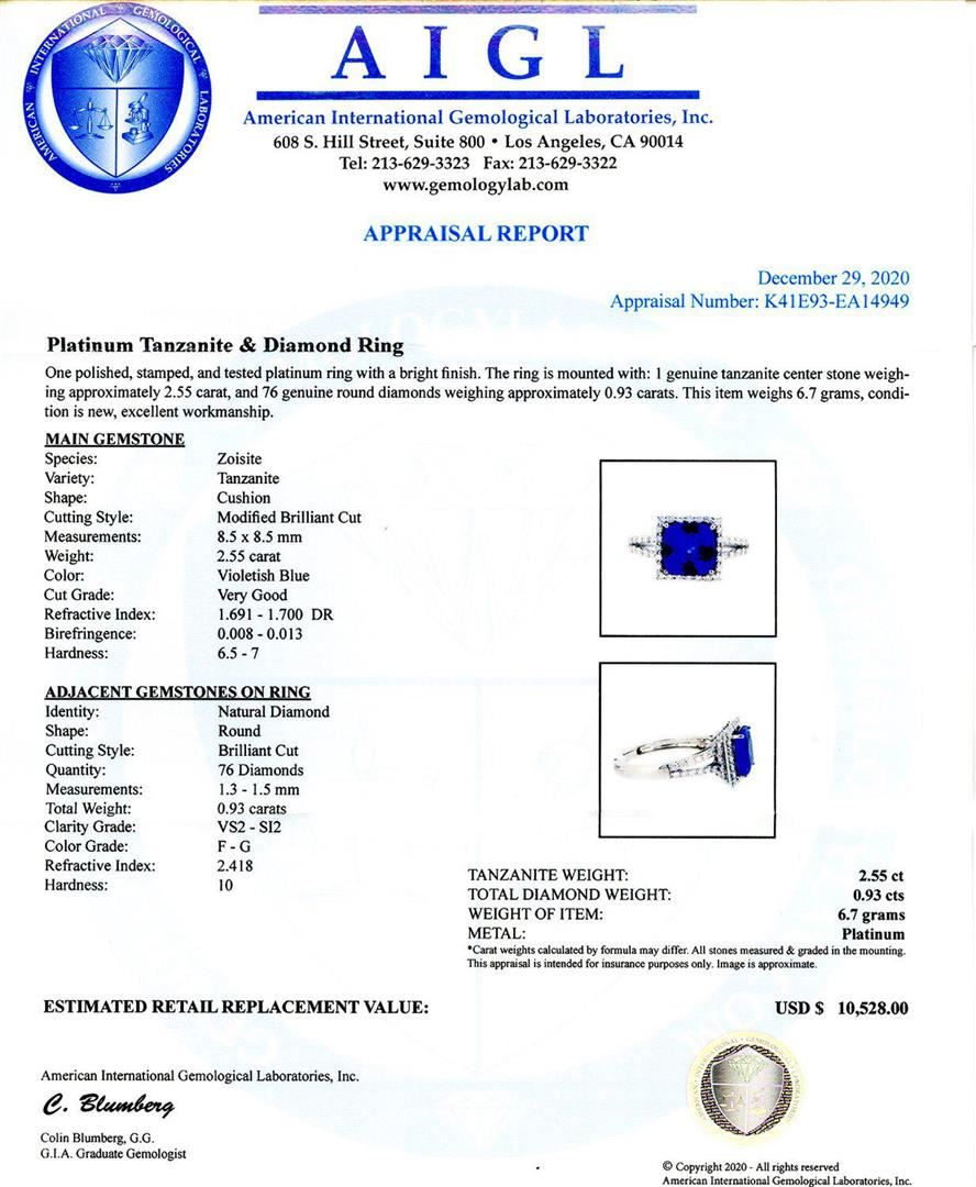 One polished, stamped, and tested platinum ring with a bright finish. The ring is mounted with: 1 genuine tanzanite center stone weighing approximately 2.55 carat, and 76 genuine round diamonds weighing approximately 0.93 carats. This item weighs 6.7 grams, condition is new, excellent workmanship. MAIN GEMSTONE Species: Zoisite Variety: Tanzanite Shape: Cushion Cutting Style: Modified Brilliant Cut Measurements: 8.5 x 8.5mm Weight: 2.55 carat Color: Violetish Blue Cut Grade: Very Good Refractive Index: 1.691 - 1.700 DR Birefringence: 0.008 - 0.013 Hardness: 6.5 - 7 ADJACENT GEMSTONES ON RING Identity: Natural Diamond Shape: Round Cutting Style: Brilliant Cut Quantity: 76 Diamonds Measurements: 1.3 - 1.5mm Total Weight: 0.93 carats Clarity Grade: VS2 to SI2 Color Grade: F - G Refractive Index: 2.418 Hardness: 10 TANZANITE WEIGHT: 2.55ct TOTAL DIAMOND WEIGHT: 0.93ctw WEIGHT OF ITEM: 6.7 grams METAL: Platinum