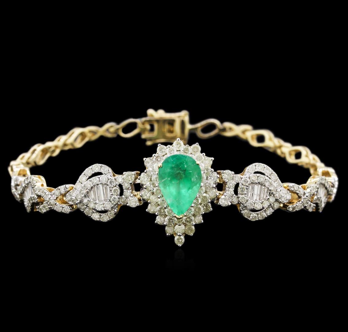 One electronically tested 14KT yellow gold ladies cast & assembled emerald and diamond bracelet with a bright polish finish. The seven and one half inch length flexible bracelet features an emerald set within a diamond frame, supported by diamond and 14KT yellow gold ribbons and an elaborate under gallery, terminating in a concealed clasp with safety. Trademark is ORIANNE. Identified with markings of "14K". Condition is new. Containing: One prong set pear mixed cut natural emerald, measuring 11.60 x 8.00 x 5.20mm, approximate total weight of 2.55ct., clarity is moderately included, type III, medium, very slightly grayish, very slightly bluish green color, (GIA vslbG 5/3), cut is good. Transmitting light with a minimum of distortion, transparent. Naturally occurring internal & external characteristics are present. Graded in the setting. Two Hundred prong set round brilliant & baguette cut diamonds approximate total weight of 200 Stones = 4.01ct. Graded in the setting. Clarity: SI-1 to I-1. Color: H - I. Total Weight of Colored Stones 2.55ct. Total Weight of Diamonds 4.01ct. AIG Appraised at $15,875.00.