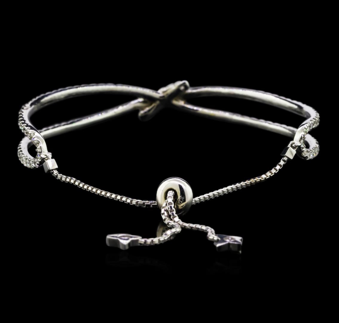 One electronically tested 14KT white gold lady's combination cast & assembled bypass crossover bangle bracelet with a bright polish finish. The featured lady's bangle bracelet has an attached, adjustable chain with bead that adds length to the bangle bracelet, which measures approximately 7 inches including the attached chain. Identified with markings of "K14". Condition is new, good workmanship. Containing: One Hundred Twenty prong set round brilliant cut diamonds, measuring 1.80 - 1.75 x 1.10mm (depth est.) approximate total weight of 120 Stones = 2.55ct. Graded in the setting. Clarity: SI-1 to I-1. Color: H - I. Cut Good. Total Weight of Diamonds 2.55ct. Total Weight of Bangle Bracelet 11.40gm. GAS Appraised at $7,745.00.
