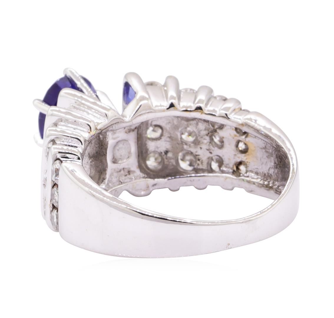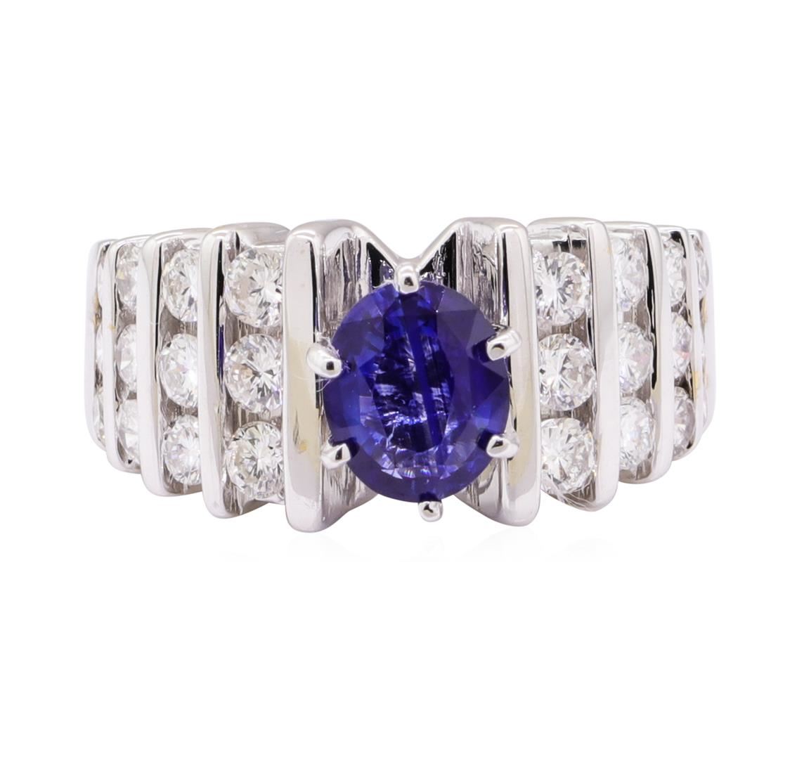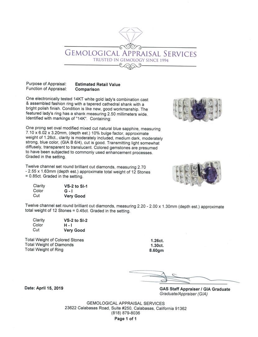 One electronically tested 14KT white gold lady's combination cast & assembled fashion ring with a tapered cathedral shank with a bright polish finish. The featured lady's ring has a shank measuring 2.50 millimeters wide. Identified with markings of '14K'. Condition is like new, good workmanship. Containing: One prong set oval modified mixed cut natural blue sapphire, measuring 7.10 x 6.02 x 3.20mm, (depth est.) 10%. bulge factor, approximate weight of 1.26ct., clarity is moderately included, medium dark, moderately strong, blue color, (GIA B 6/4), cut is good. Transmitting light somewhat diffusely, transparent to translucent. Colored gemstones are presumed to have been subjected to commonly used enhancement processes. Graded in the setting. Twelve channel set round brilliant cut diamonds, measuring 2.70 - 2.55 x 1.63mm (depth est.) approximate total weight of 12 Stones = 0.85ct. Graded in the setting. Color G - I Clarity VS-2 to SI-1 Cut Very Good Twelve channel set round brilliant cut diamonds, measuring 2.20 - 2.00 x 1.30mm (depth est.) approximate total weight of 12 Stones = 0.45ct. Graded in the setting. Color H - I Clarity VS-2 to SI-2 Cut Very Good. Total Weight of Colored Stones 1.26ct.. Total Weight of Diamonds 1.30 ct.. Total Weight of Ring 8.60gm GAS Appraised at $5600.00. GAS Appraised.