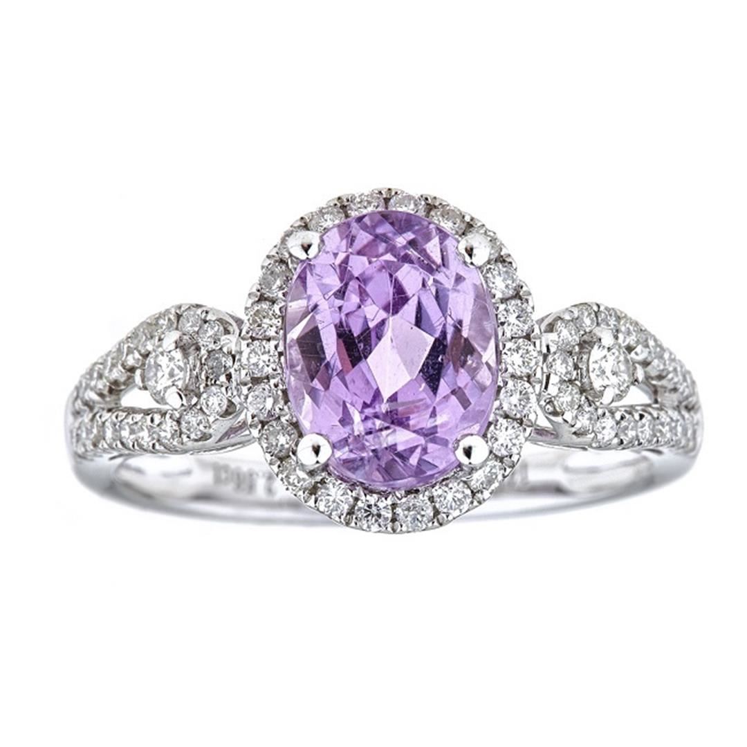 One Kunzite and Diamond Ring featuring: 14KT White Gold with a total weight of 2.35 grams, Kunzite with a total weight of 2.56ct, and 62 Round Cut Diamonds with a total weight of 0.45ctw.