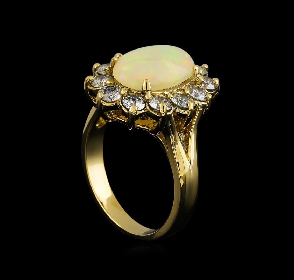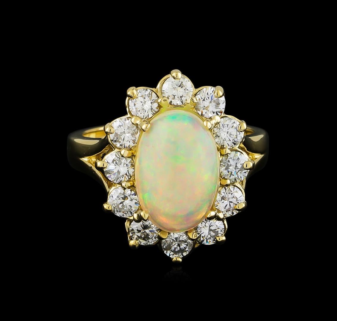 One electronically tested 14KT yellow gold ladies cast opal and diamond ring with a bright polish finish. The featured opal is set within a diamond floret, completed by a two and one-half millimeter wide band. Identified with markings of "14K". Condition is new, good workmanship. Containing: One semi crystal opal that is cut in a oval shaped cabochon and is prong set, measuring 11.90 mm long x 8.10 mm wide, and 4.10 mm thick and the approximate weight is 2.56 carats. The opal has a bright, multicolor play of color (fire) in a flashfire pattern; a medium dome; a good cut; no inclusions; consistent in its brightness and pattern; and is not directional. Graded in the setting. Twelve prong set round brilliant cut diamonds, measuring 3.00 - 3.00 x 1.80mm (depth est.) approximate. Total Weight of 12 Stones = 1.28ct. Graded in the setting. Clarity: SI-2 to I-1. Color: G - I. Total Weight of Diamonds 1.28ct. Total Weight of Opals 2.56ct. Total Weight of Ring 6.89gm. AIG Appraised at $5,635.00.